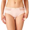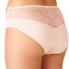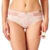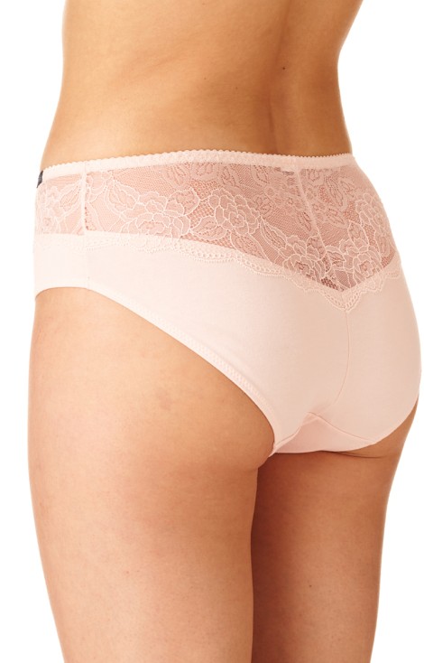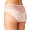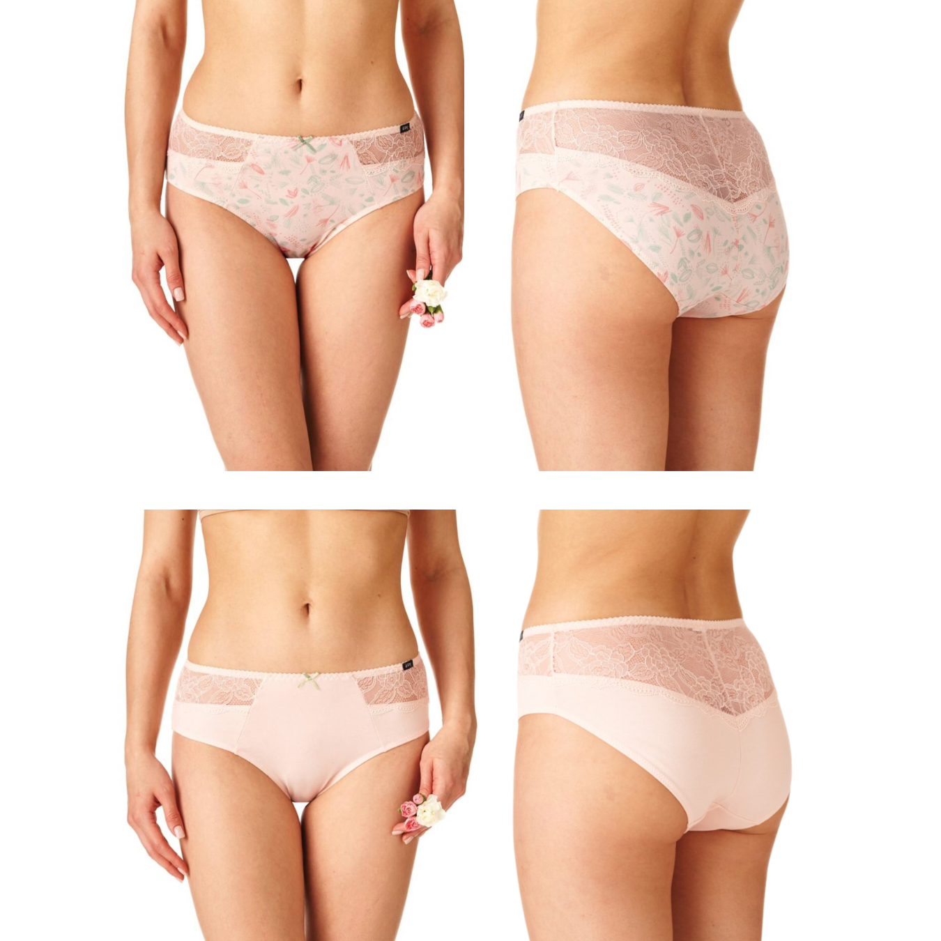Klasyczny krój „midi bikini” z szerokim bokiem (13,5 cm w rozmiarze M) i pełnym tyłem otula biodra i pośladki, a subtelna koronka dodaje kobiecego uroku. Pastelowe odcienie brzoskwini i zieleni sprawiają, że figi wyglądają elegancko i delikatnie.