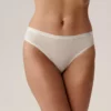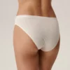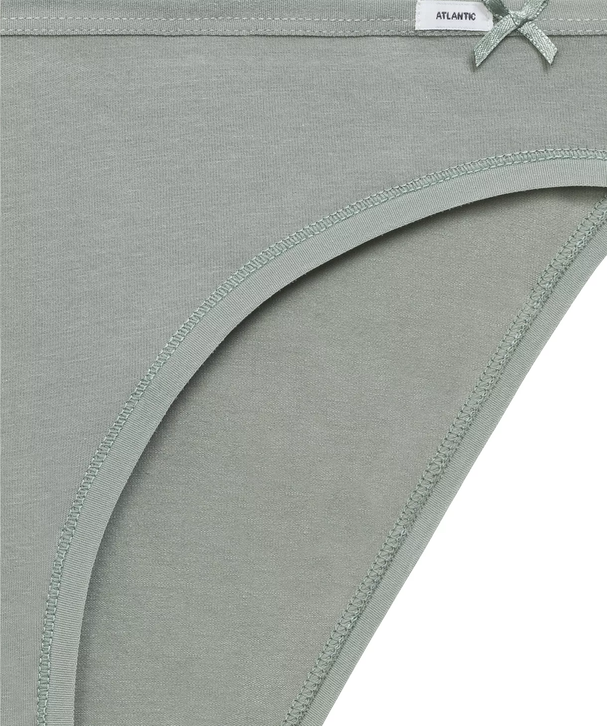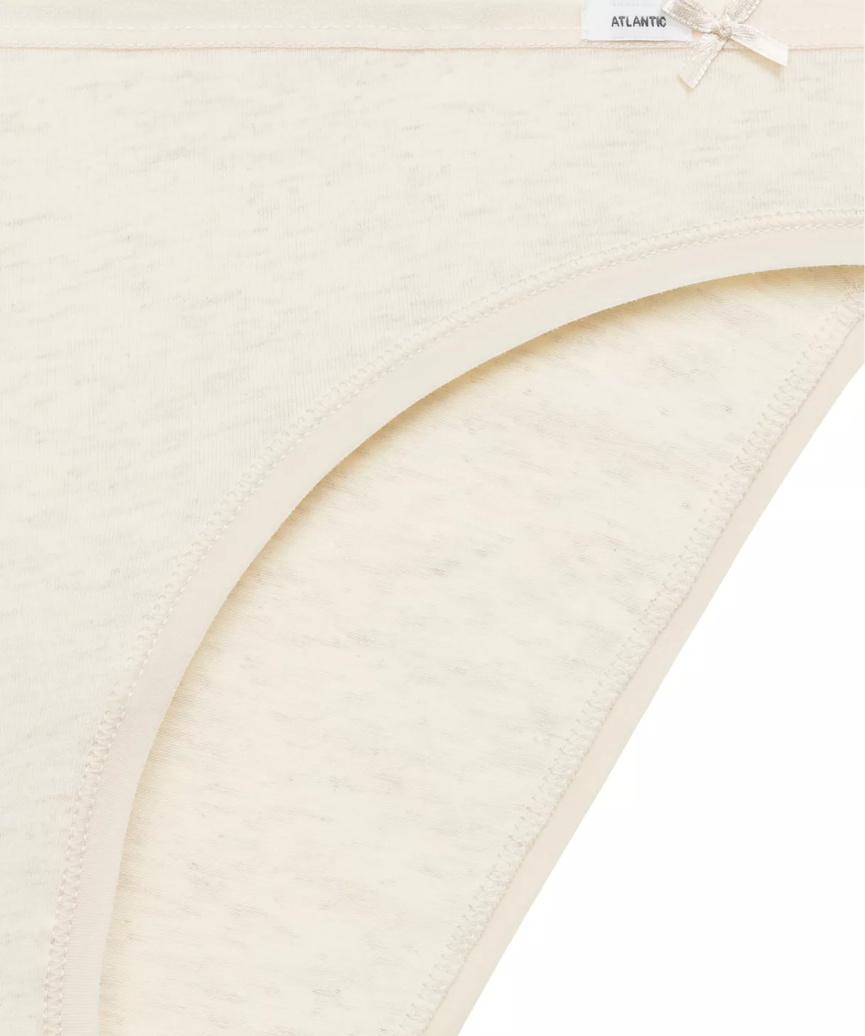 Figi damskie bikini w tym zestawie, mają kolory: beżowy, beżowy melanż oraz jasno-zielony. Krój bikini wyróżnia się niskim stanem (z miękką i nieuciskającą lamówką, ozdobioną subtelnym logo Atlantic oraz małą kokardką z boku), głębszymi wycięciami po bokach, optycznie wydłużającymi nogi oraz zabudowanym tyłem.