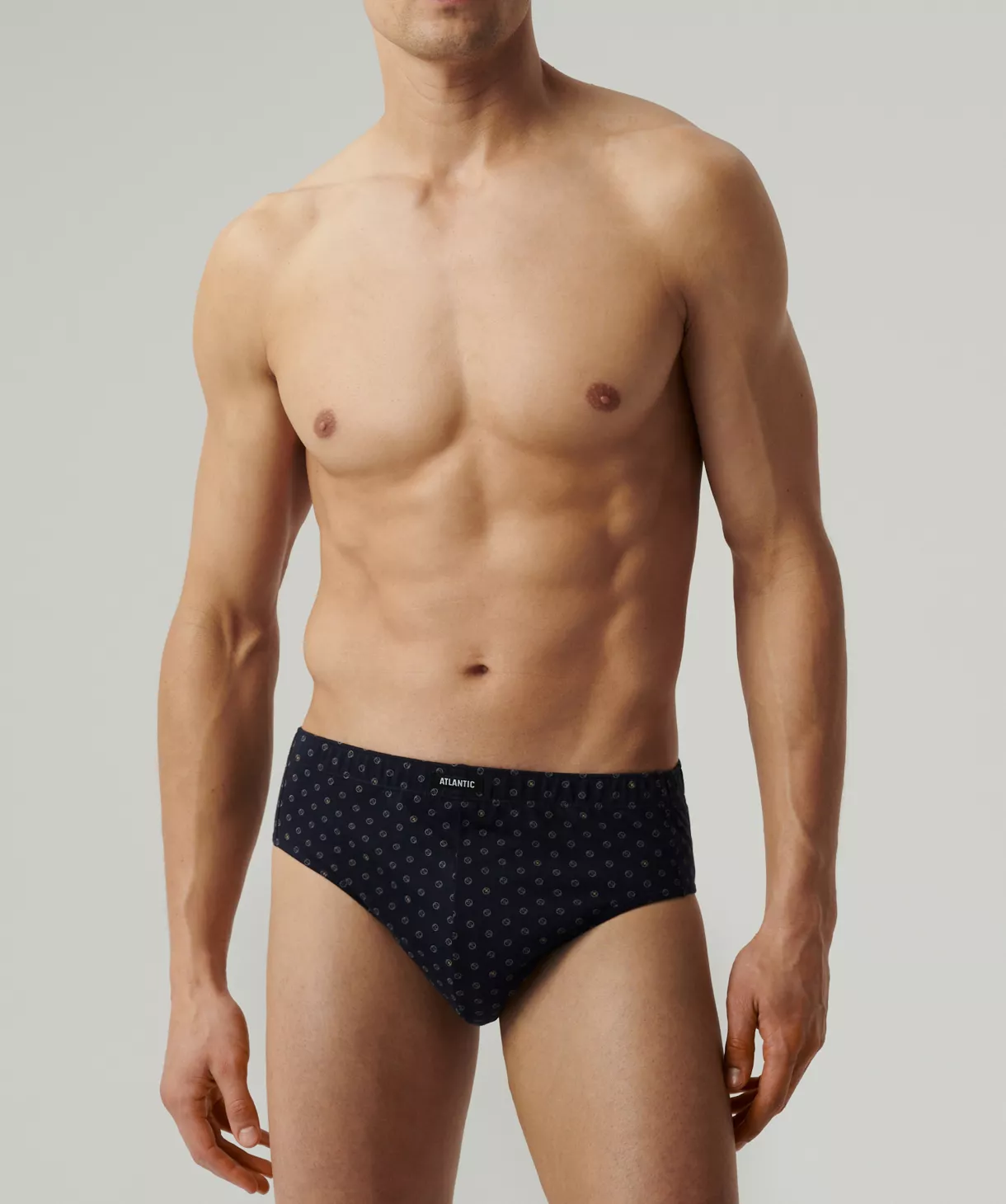 W 3-packu znajdują się slipy męskie w kolorze granatowym i ciemno-niebieskim (z małymi wzorkami w guziki) oraz jedna para gładkich, niebieskich majtek. Slipy o klasycznym kroju mają uniwersalnej wysokości talię, w której wykończone są miękką i nieuciskającą ciała gumą wewnętrzną z logo Atlantic oraz dość szerokie boki. Majtki wykonane są z przyjemnej w dotyku i przyjaznej dla skóry bawełny, która ponadto zapobiega poceniu się ciała i jest wytrzymała w użytkowaniu.