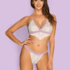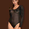 Odważne body z chokerem z satynowym wiązaniem na szyi. Pikantny, koronkowy pasek biegnący wzdłuż tułowia. Panterka na dolnej części. Skład: 90% poliamid, 10% elastan.
