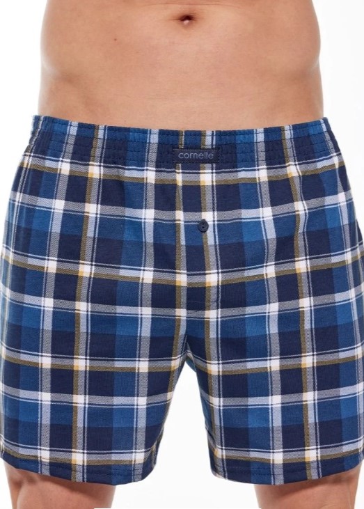 Bokserki męskie o luźnym fasonie w kratę. Wygodna guma w pasie obszyta bawełną. Rozporek zapinany na guzik. Pakowane w pudełko. Skład: 100% bawełna.