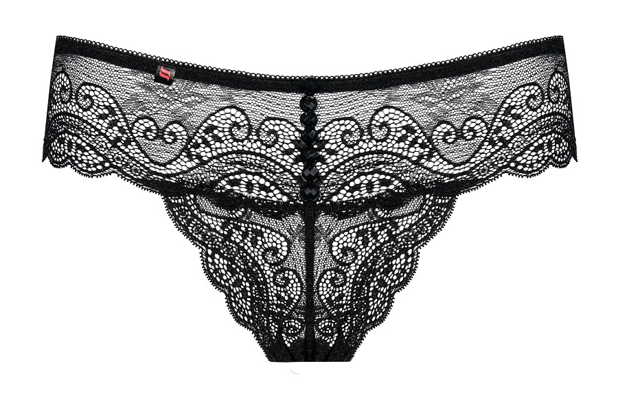 – eleganckie, koronkowe stringi- zdobienia przykuwają uwagę – rząd połyskujących kamyczków z przodu dodaje uroku- trójkątne przeszycia z tyłu podkreślają pośladki- delikatna koronka idealnie dopasowuje się do kształtów (90% poliamid, 10% elastan).