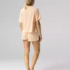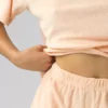 Delikatny odcień brzoskwiniowy dodaje temu zestawowi lekkości i świeżości. Zarówno koszulka, jak i szorty mają uniwersalny, ale z charakterem design, dzięki czemu świetnie sprawdzą się nie tylko jako odzież domowa, ale też jako piżama.