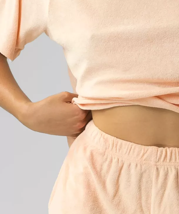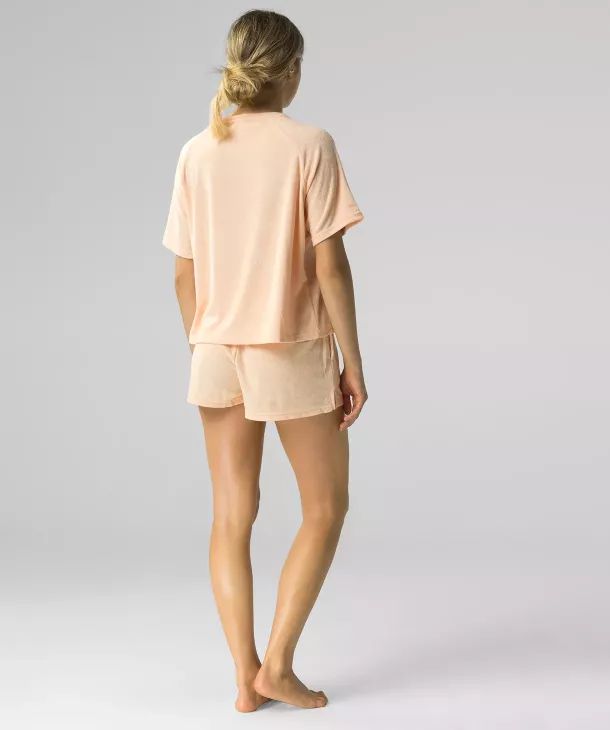 Delikatny odcień brzoskwiniowy dodaje temu zestawowi lekkości i świeżości. Zarówno koszulka, jak i szorty mają uniwersalny, ale z charakterem design, dzięki czemu świetnie sprawdzą się nie tylko jako odzież domowa, ale też jako piżama.