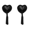 Urocze nakładki na biust w kształcie serca. Satynowa tkanina dookoła ozdobiona została delikatnym połyskującym haftem a na środku przymocowano figlarny frędzelek. Nakładki są samoprzylepne, wielokrotnego użytku. W zestawie dwie sztuki.