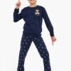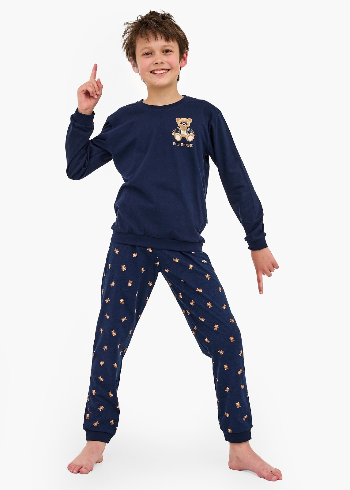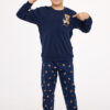 Piżama chłopięca wykonana jest z wysokiej jakości bawełny, dzięki czemu jest miękka, przyjemna w dotyku i przewiewna, co zapewnia komfort podczas snu. Góra piżamy to koszulka z długim rękawem, ozdobiona z przodu kolorowym nadrukiem przedstawiającym uroczego misia, który z pewnością przypadnie do gustu każdemu dziecku. Spodnie mają długie nogawki i są wzorzyste, co dodaje piżamie atrakcyjnego wyglądu oraz zabawnego charakteru. W pasie zastosowano gumkę, która zapewnia wygodne dopasowanie do sylwetki dziecka i ułatwia zakładanie oraz zdejmowanie piżamy. Mankiety przy rękawach, dół koszulki oraz nogawki spodni zakończone są elastycznymi ściągaczami, co zapobiega podciąganiu się ubrań i pomaga utrzymać ciepło podczas snu. Całość jest starannie wykonana i zapakowana w estetyczne pudełko, co sprawia, że piżama może być również świetnym pomysłem na prezent. To praktyczny i stylowy komplet, który łączy wygodę z atrakcyjnym wzornictwem, idealny dla każdego chłopca.