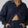 Głęboki odcień granatu tej piżamy nie tylko oddaje hołd wieczornemu niebu, ale również wprowadza element luksusu do Twojej sypialni. Oversize’owa bluzka z kołnierzykiem i długimi rękawami, zapinana na guziczki, łączy w sobie elegancję z nonszalancją, zapewniając swobodę ruchów. Krótkie spodenki z dwiema kieszeniami i ściągaczem w talii to kwintesencja wygody. Ale to nie wszystko. Kolejny sekret tkwi w materiale…
