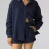 Głęboki odcień granatu tej piżamy nie tylko oddaje hołd wieczornemu niebu, ale również wprowadza element luksusu do Twojej sypialni. Oversize’owa bluzka z kołnierzykiem i długimi rękawami, zapinana na guziczki, łączy w sobie elegancję z nonszalancją, zapewniając swobodę ruchów. Krótkie spodenki z dwiema kieszeniami i ściągaczem w talii to kwintesencja wygody. Ale to nie wszystko. Kolejny sekret tkwi w materiale…