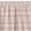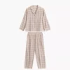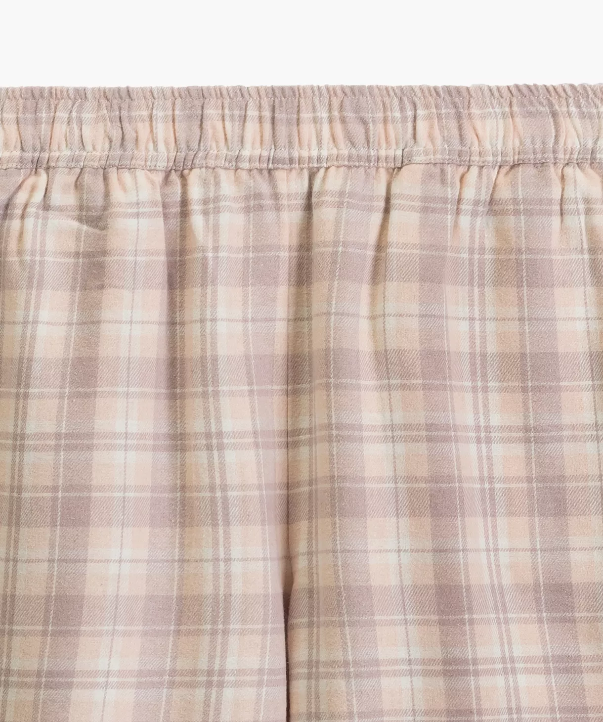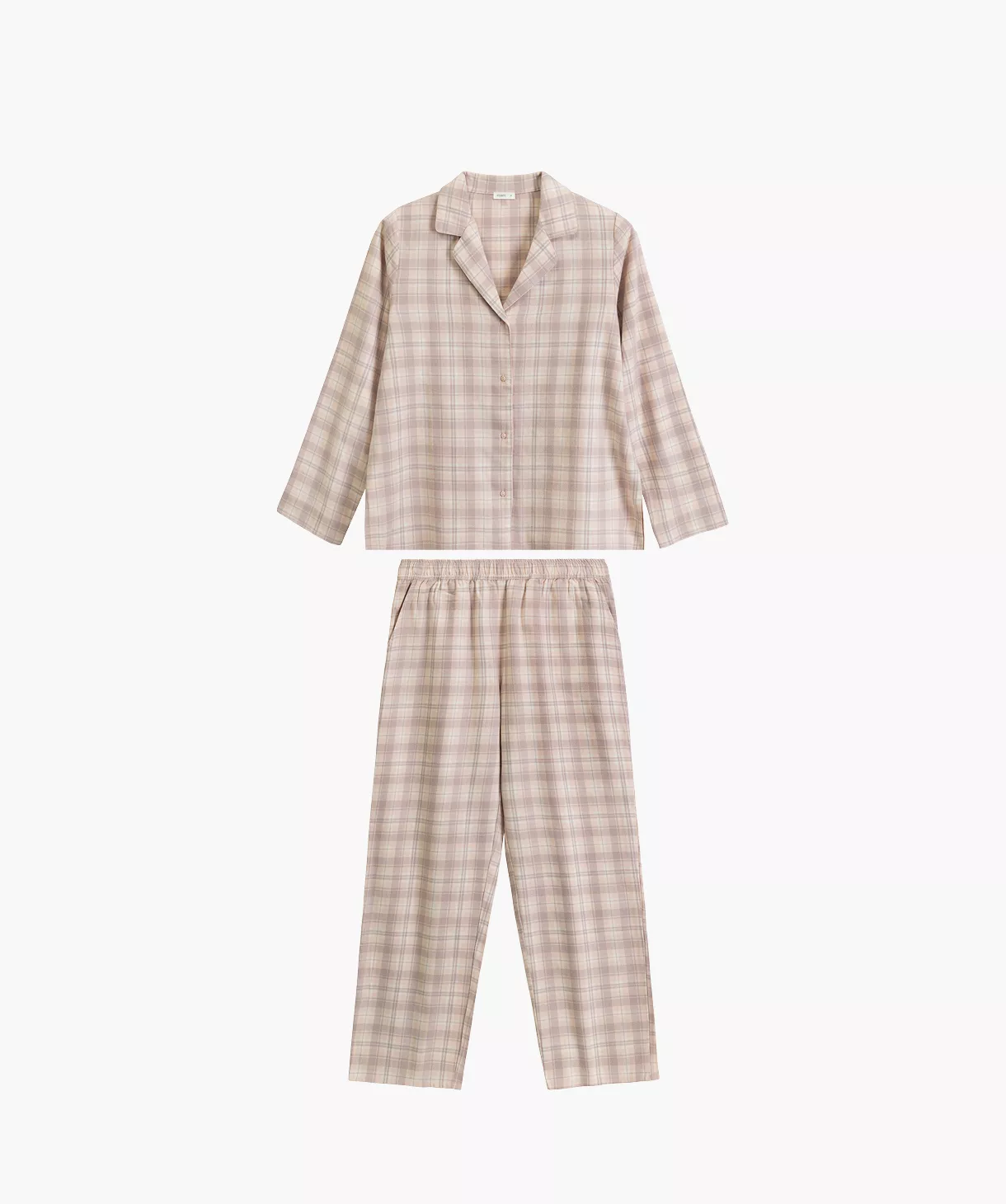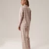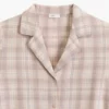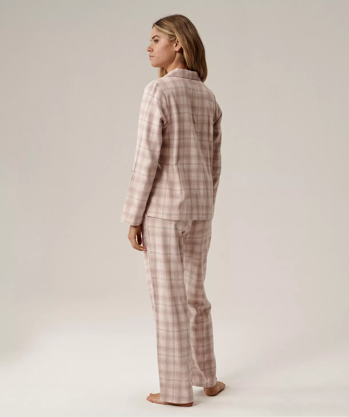 W skład tej damskiej piżamy w lawendowo-brzoskwiniowo-ecru kratę, wchodzi bluzka z długimi rękawami oraz długie spodnie z szerokimi nogawkami. Bluzka o koszulowym kroju ma kołnierz, wycięcie w kształcie litery V oraz zapięcie na guziki, natomiast spodnie mają praktyczne kieszenie po bokach i nieuciskający ściągacz w pasie.