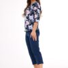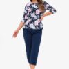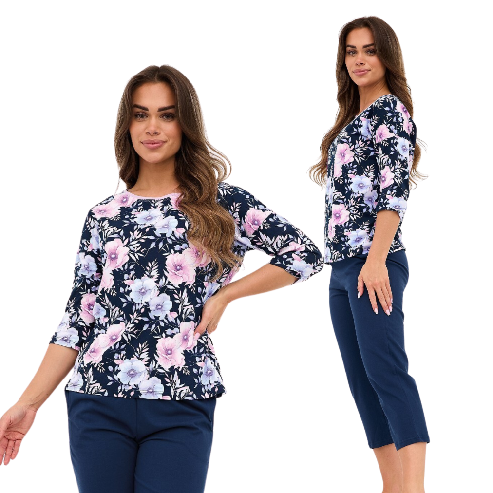 Damska piżama uszyta z wysokiej jakości bawełny zapewnia maksymalny komfort i swobodę noszenia. Koszulka z rękawem 3/4 ozdobiona jest subtelnym, kwiatowym printem, który nadaje jej delikatnego, kobiecego charakteru. Posiada półokrągły dekolt starannie obszyty lamówką, co dodaje elegancji i estetycznego wykończenia. Do kompletu dołączone są jednolite bawełniane spodnie o długości 3/4 – lekkie, przewiewne i doskonałe na cieplejsze noce. Całość tworzy harmonijny, stylowy zestaw idealny na wiosnę i lato. To doskonały wybór dla kobiet ceniących wygodę, naturalne tkaniny i subtelne wzornictwo.