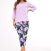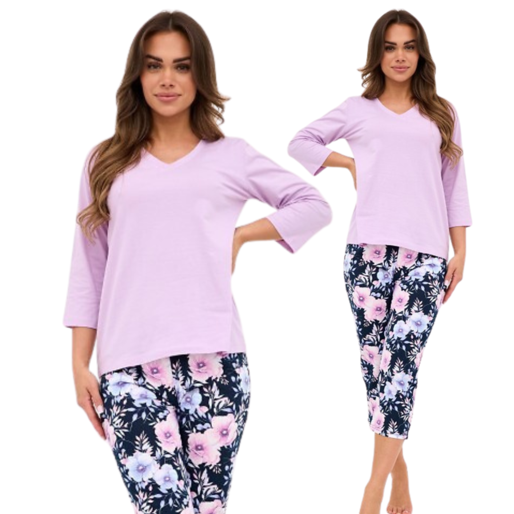Bawełniana piżama damska to idealny wybór na komfortowy sen i relaks w domu. Koszulka w jednolitym kolorze z rękawem 7/8 i dekoltem w kształcie litery „V” zapewnia wygodę oraz kobiecy, elegancki wygląd. Do kompletu dołączone są spodnie typu rybaczki ozdobione kolorowym, kwiatowym printem, które dodają całości świeżego i modnego charakteru. W pasie znajduje się elastyczna gumka, gwarantująca wygodne dopasowanie do sylwetki. Piżama wykonana jest w całości z miękkiej, przewiewnej bawełny, co sprawia, że jest przyjemna w dotyku i trwała. Całość pakowana jest w estetyczne pudełko, dzięki czemu zestaw sprawdzi się także jako praktyczny i elegancki prezent.
