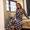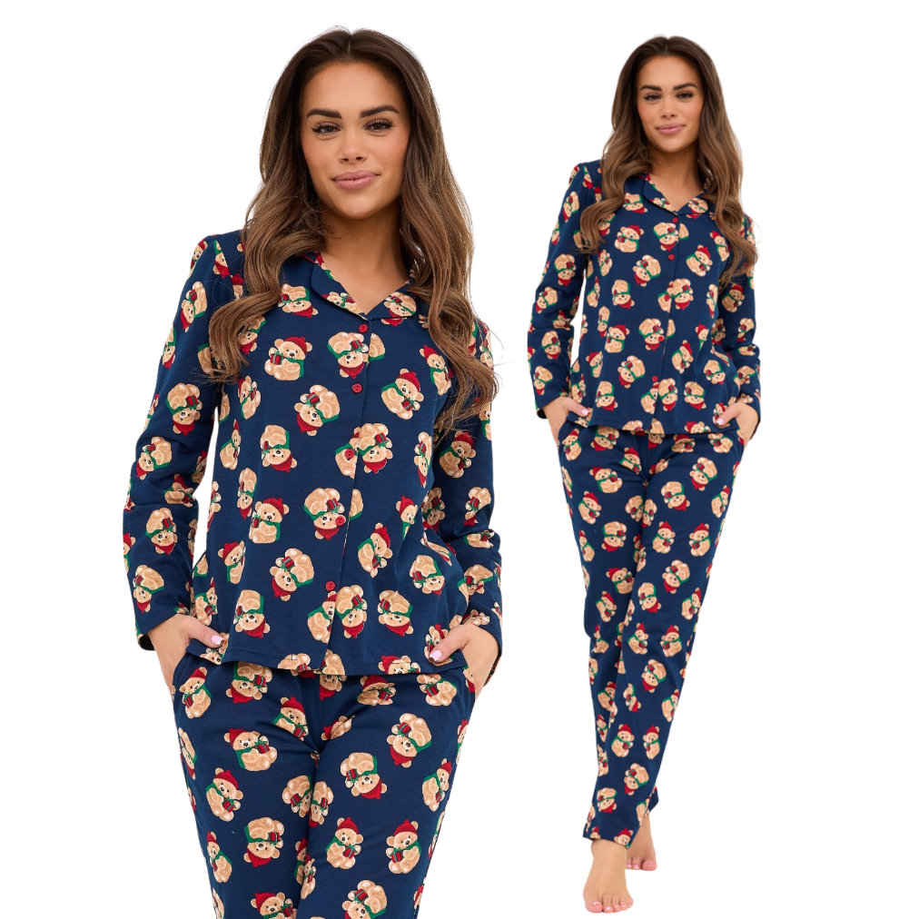 Piżama damska z kolekcji Merry Christmas to elegancki i wygodny zestaw na zimowe, świąteczne wieczory. Wykonana z wysokiej jakości bawełny, zapewnia komfort noszenia i przyjemne uczucie miękkości na skórze. Bluza z długim rękawem ozdobiona jest świątecznym printem, posiada kołnierzyk i zapinana jest na guziki, co dodaje zestawowi klasycznego uroku. Długie spodnie wyposażone są w gumkę w pasie obszytą bawełną, co zapewnia wygodne dopasowanie i swobodę ruchów. Piżama łączy funkcjonalność z atrakcyjnym świątecznym designem, idealna do relaksu w domu lub jako prezent.