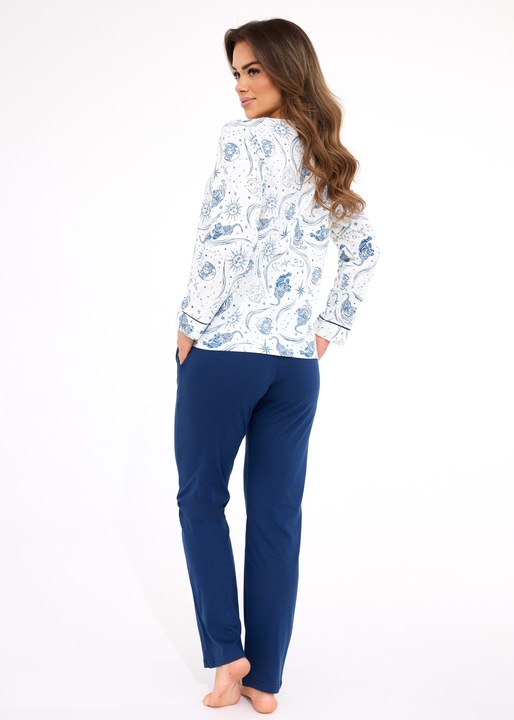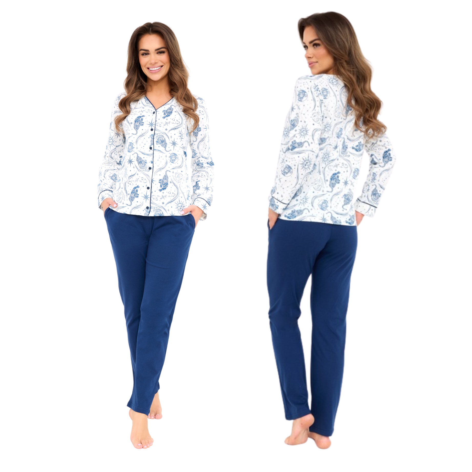 Ta piżama damska to połączenie wygody, stylu i jakości, które docenisz każdej nocy. Wykonana z wysokogatunkowej bawełny, jest miękka, oddychająca i przyjazna dla skóry – idealna zarówno na chłodniejsze, jak i cieplejsze wieczory. Góra piżamy to klasyczna koszulka z długim rękawem, zapinana na guziki, dzięki czemu łatwo się ją zakłada i zdejmuje. Uroku dodaje jej subtelny, gwiezdny print, który nadaje całości delikatnego, kobiecego charakteru.