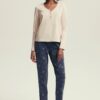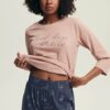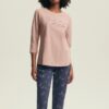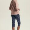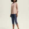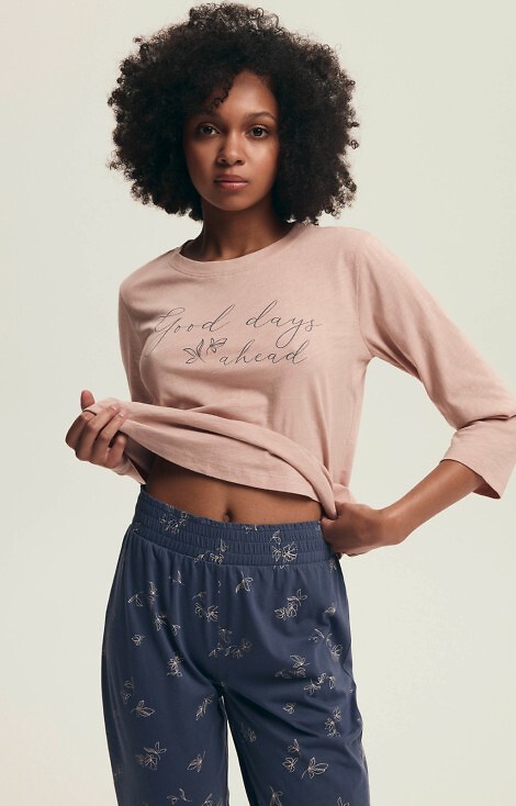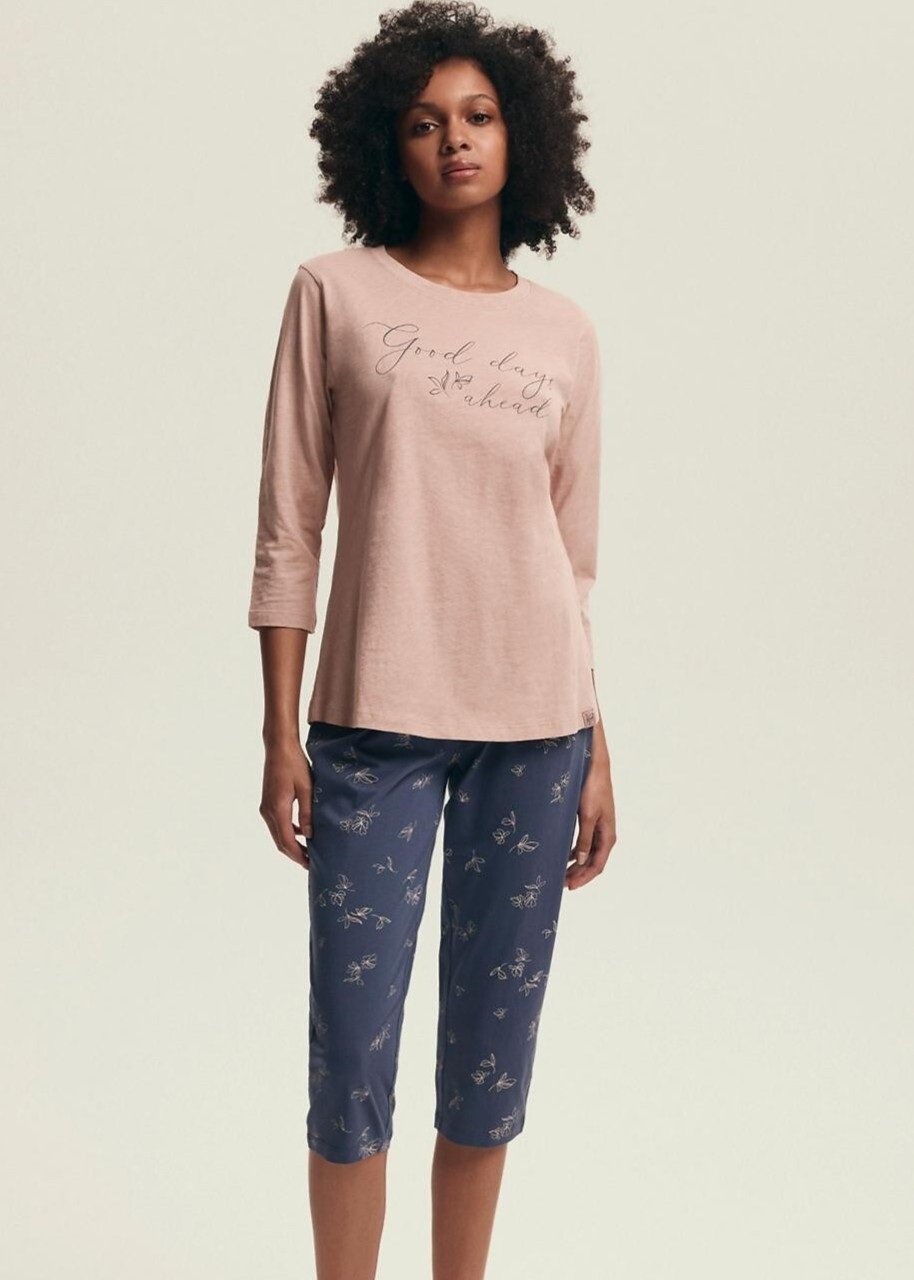 Bawełniana piżama damska z okrągłym dekoltem, przód ozdobiony nadrukiem, rękaw 3/4. Do kompletu rybaczki z roślinnym printem z szeroką, wygodną gumką w pasie. Skład: 100% bawełna.