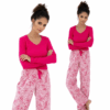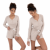 Piżama damska wykonana z miłej, miękkiej tkaniny w drobne kwiatuszki to propozycja łącząca wygodę z subtelnym, kobiecym stylem. Długi rękaw zakończony ściągaczami zapewnia komfort noszenia, utrzymując rękawy na właściwym miejscu, a dekolt w kształcie litery „V” z zapięciem na guziki dodaje całości elegancji i delikatnego uroku. Do kompletu dołączone są krótkie spodenki, które zwiększają swobodę ruchów i przewiewność, idealne na cieplejsze dni lub noce. W pasie zastosowano satynową kokardkę, która podkreśla kobiecy charakter zestawu. Piżama jest lekka, przyjemna w dotyku i świetnie sprawdzi się zarówno podczas snu, jak i w domowym relaksie, łącząc funkcjonalność z estetyką.
