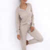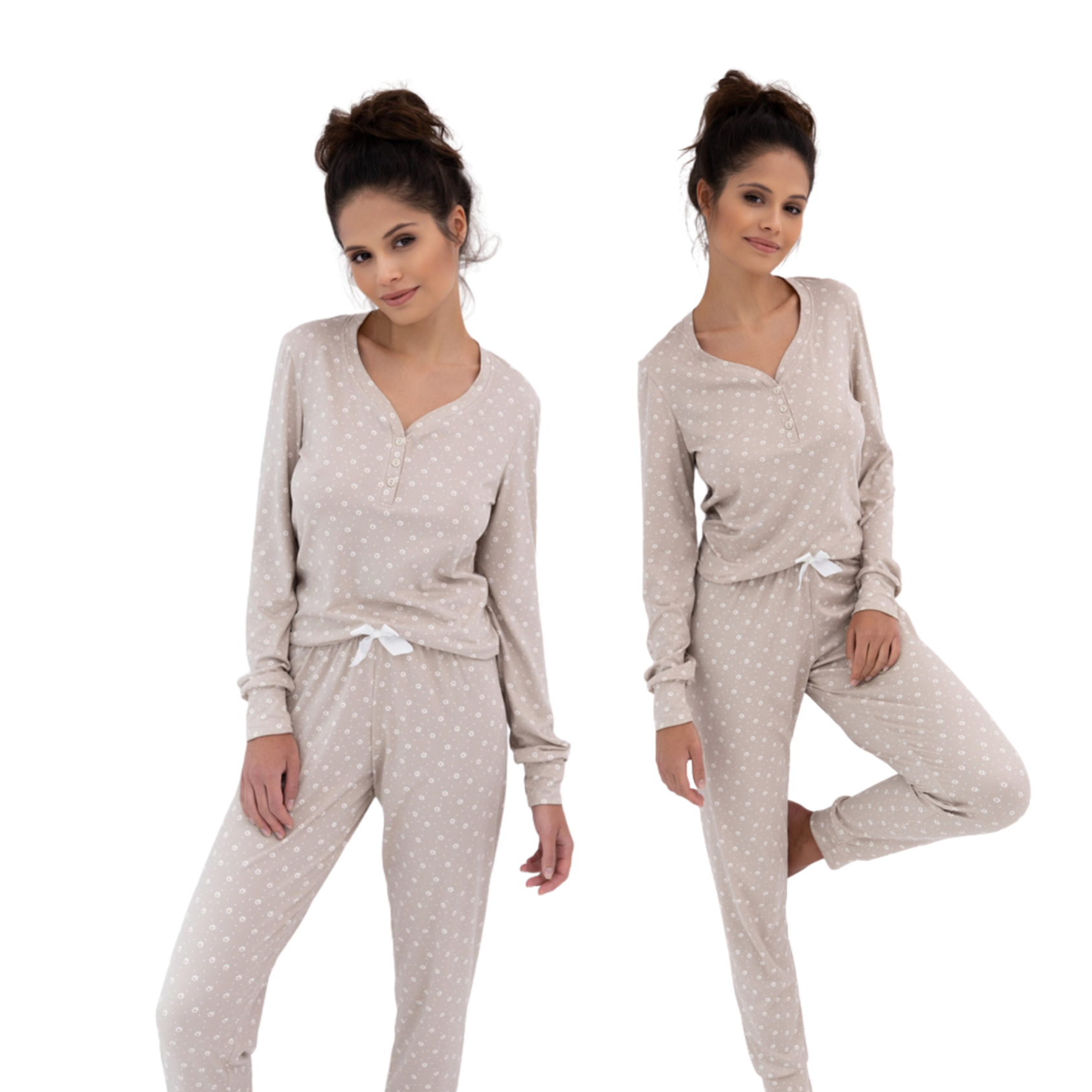 Piżama damska wykonana z miękkiej, przyjemnej w dotyku tkaniny w drobne kwiatuszki to idealny wybór na spokojne, domowe wieczory. Długi rękaw zakończony ściągaczami zapewnia komfort noszenia i utrzymuje rękawy na właściwym miejscu, a dekolt w kształcie litery „V” z zapięciem na guziki dodaje zestawowi elegancji i subtelnego uroku. Długie spodnie zapewniają pełną swobodę ruchów oraz wygodę podczas snu i relaksu. W pasie zastosowano satynową kokardkę, która stanowi dekoracyjny akcent i podkreśla kobiecy charakter piżamy. Lekka, elastyczna tkanina sprawia, że zestaw jest komfortowy, miękki i przyjemny w noszeniu, łącząc funkcjonalność z delikatnym, romantycznym stylem.