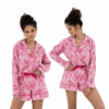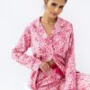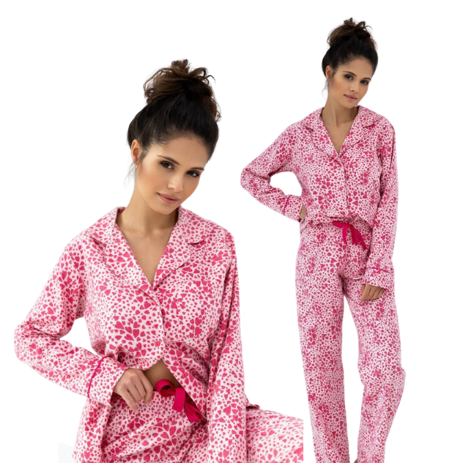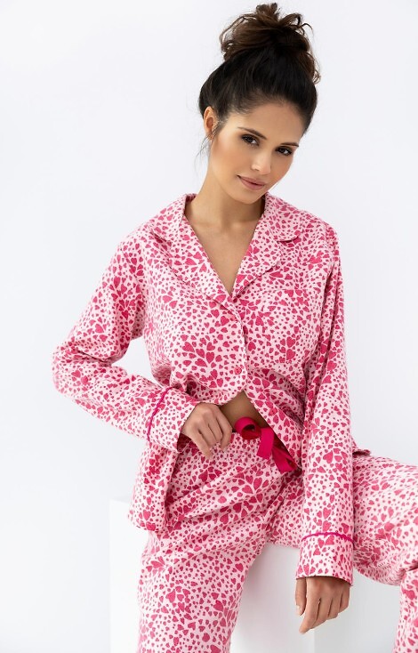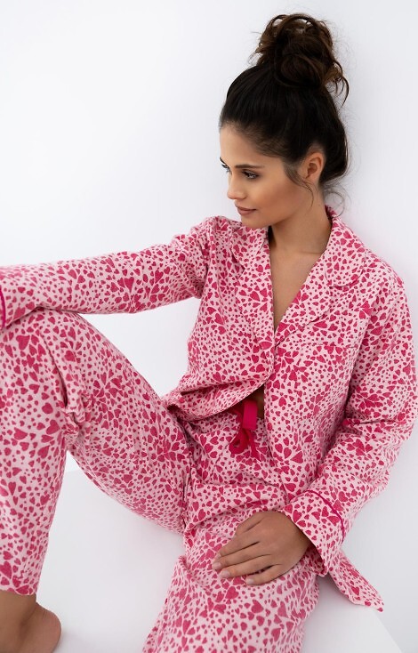 Piżama damska wykonana z wysokiej jakości, delikatnej flaneli w serduszka to propozycja łącząca komfort i uroczy, romantyczny wygląd. Miękki i przyjemny w dotyku materiał zapewnia wygodę noszenia przez całą noc oraz odpowiednią izolację podczas chłodniejszych wieczorów. Bluza z kołnierzykiem i długim rękawem została zaprojektowana z myślą o funkcjonalności, z wygodnym zapięciem na guziki oraz naszytą kieszonką na piersi, która dodaje subtelnego uroku. Długie spodnie o luźnym kroju gwarantują pełną swobodę ruchów, a w pasie zastosowano wiązaną tasiemkę, która umożliwia idealne dopasowanie. Piżama pakowana jest w foliowy woreczek, co sprawia, że doskonale nadaje się również na elegancki prezent.