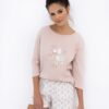 Bawełniana piżama damska to propozycja, która łączy wygodę z uroczym, kobiecym stylem. Wykonana w całości z wysokiej jakości bawełny, jest miękka, przewiewna i doskonale sprawdza się zarówno podczas snu, jak i relaksu w domu. Koszulka z rękawem 3/4 oraz klasycznym, okrągłym dekoltem zapewnia komfort noszenia i świetnie układa się na sylwetce. Z przodu umieszczono wesoły nadruk z lamą, który dodaje zestawowi oryginalnego charakteru i lekkości. Do kompletu dołączone zostały krótkie, wzorzyste szorty, które idealnie komponują się z górą. W pasie zastosowano elastyczną gumkę, a całość uzupełnia ozdobna satynowa kokardka, podkreślająca subtelny, dziewczęcy urok kompletu. Piżama pakowana jest w foliowy worek, co sprawia, że świetnie nadaje się także na prezent.