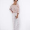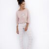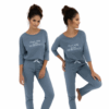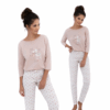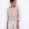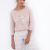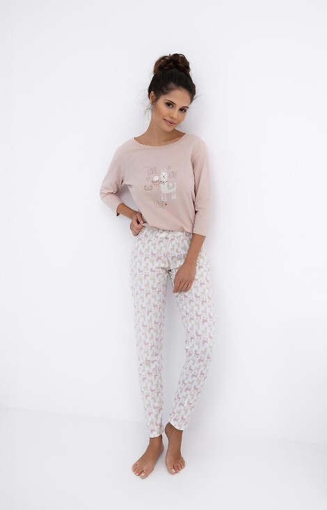 Bawełniana piżama damska to idealny wybór dla kobiet, które cenią sobie wygodę połączoną z odrobiną humoru i stylu. Wykonana z naturalnej, wysokiej jakości bawełny, jest miękka, przewiewna i przyjazna dla skóry, co zapewnia pełen komfort podczas snu i odpoczynku. Koszulka z rękawem 3/4 i okrągłym dekoltem została ozdobiona uroczym nadrukiem z lamą, który wprowadza pogodny i zabawny akcent. Do kompletu dołączone są długie, wzorzyste spodnie, które dodają zestawowi charakteru i świetnie komponują się z górą. W pasie zastosowano wygodną gumkę, a całość uzupełnia ozdobna satynowa kokardka, nadająca subtelnej elegancji. Piżama pakowana jest w praktyczny foliowy worek, co czyni ją również świetnym pomysłem na prezent.