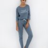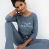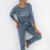 Piżama damska to doskonałe połączenie wygody i stylu, które sprawdzi się na co dzień oraz podczas spokojnych, domowych wieczorów. Została wykonana z wysokiej jakości bawełny, dzięki czemu jest miękka, przewiewna i przyjazna dla skóry, zapewniając komfort przez całą noc. Koszulka z długim rękawem i klasycznym, okrągłym dekoltem została ozdobiona subtelną grafiką z przodu, nadając całości nowoczesny i kobiecy charakter. Do zestawu dołączono długie spodnie o prostym kroju, które gwarantują pełną swobodę ruchów. W pasie znajduje się elastyczna gumka, a dodatkową ozdobę stanowi satynowa kokardka podkreślająca delikatny urok kompletu. To piżama, która łączy praktyczność z elegancją, idealna także jako pomysł na prezent.