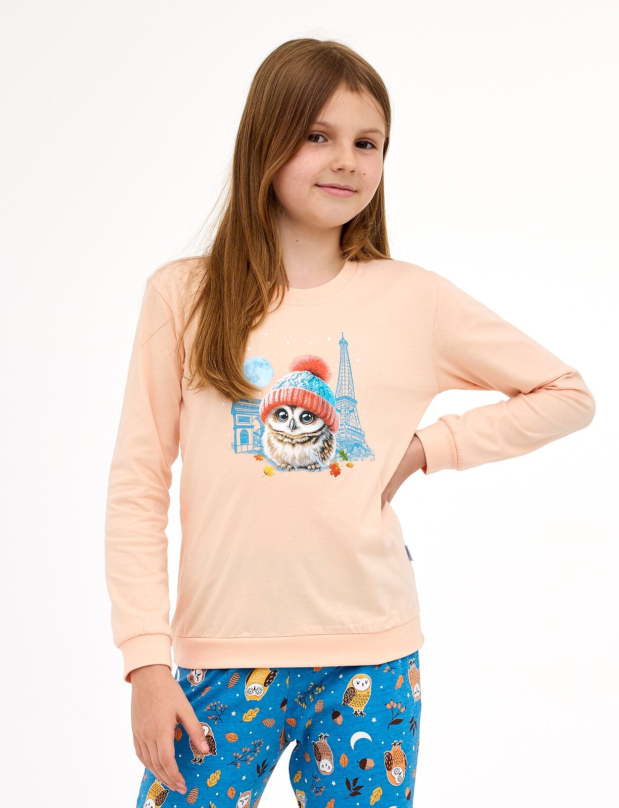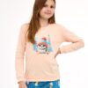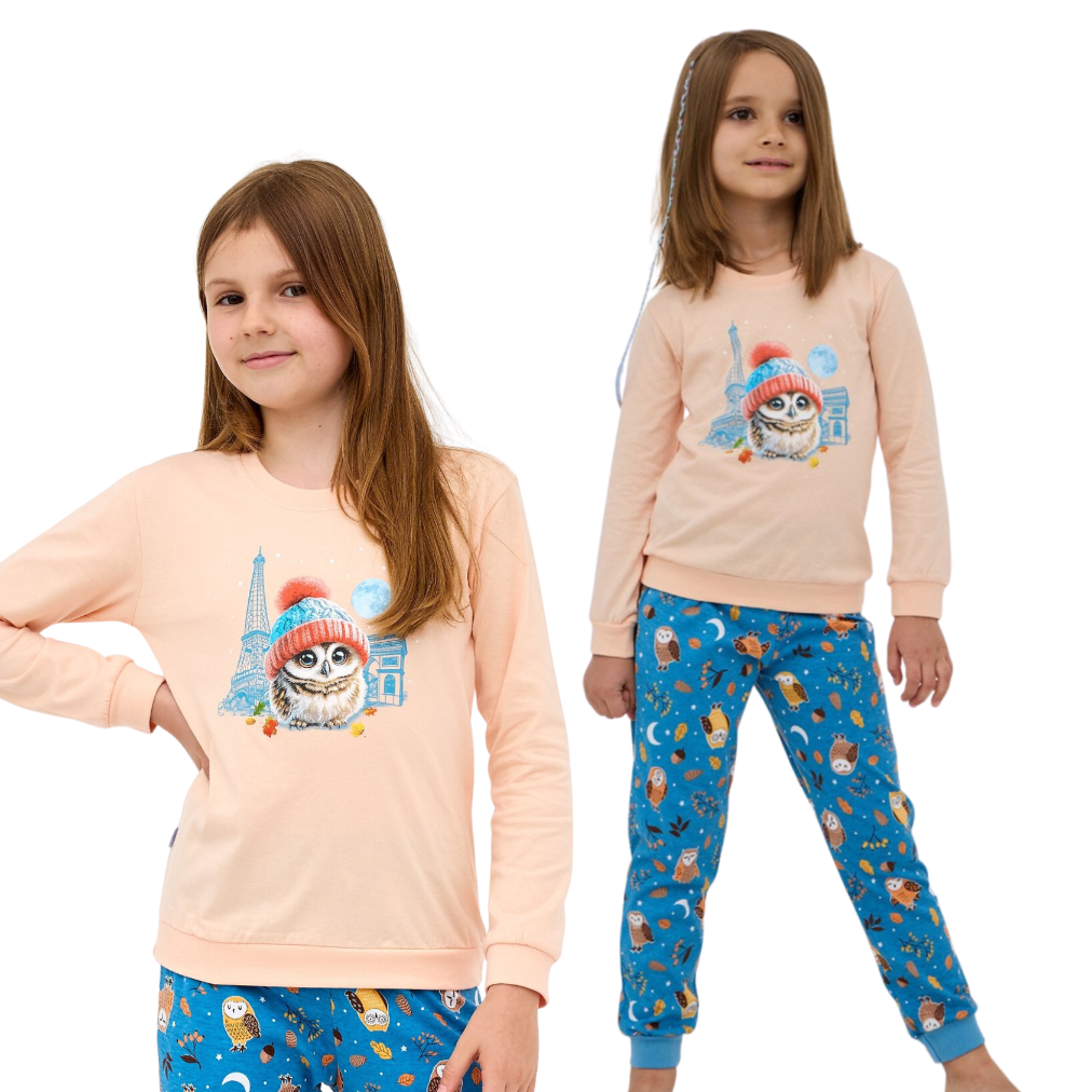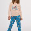 Dziewczęca piżama wykonana z wysokiej jakości, miękkiej bawełny gwarantuje komfort i wygodę podczas snu. Koszulka z długim rękawem ozdobiona jest z przodu kolorowym nadrukiem, który nadaje jej radosny i dziecięcy charakter. Do kompletu dołączone są długie, wzorzyste spodnie, które świetnie komponują się z bluzą. Rękawki, nogawki oraz dół bluzy wykończone są elastycznymi ściągaczami, które zapewniają dobre dopasowanie i chronią przed chłodem. Całość zapakowana jest w estetyczne pudełko, co sprawia, że piżama będzie także doskonałym pomysłem na prezent dla małej dziewczynki.