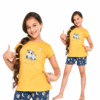 Górna część piżamy to miodowa koszulka z krótkim rękawem, ozdobiona uroczą grafiką sowy, która dodaje całości delikatnego, dziewczęcego uroku. Krótkie spodenki z subtelnym motywem księżyca idealnie dopełniają zestaw, tworząc spójną i przyjemną dla oka kompozycję.