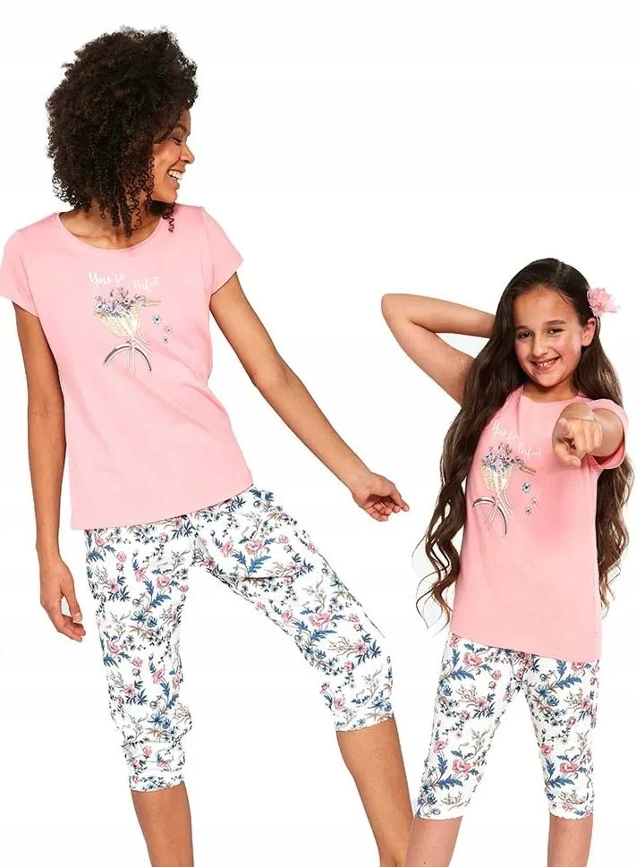 Komfortowa piżama dziewczęca Cornette DZ 490/88 Perfect to doskonały wybór na letnie noce. Wykonana z wysokiej jakości, przewiewnej bawełny, zapewnia pełen komfort i swobodę ruchów dzięki luźnemu krojowi. Góra piżamy utrzymana jest w delikatnym różowym kolorze, ozdobiona uroczą grafiką kosza z polnymi kwiatami, co dodaje zestawowi subtelności i dziewczęcego uroku. Spodenki o długości 3/4 mają kwiecisty wzór i zakończone są ściągaczami, które idealnie dopasowują się do sylwetki. Bawełniany materiał jest miękki, przyjazny dla skóry i pozwala jej oddychać, co czyni piżamę idealną na ciepłe letnie noce. To połączenie jakości, wygody i stylu dla najmłodszych.