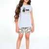 Do kompletu dołączone są białe spodenki w drobne, żółto-czarne kotki. Dzięki elastycznej gumce w pasie i luźnemu krojowi, zapewniają pełną swobodę ruchów i wygodę podczas snu. Całość tworzy harmonijny, dziewczęcy zestaw, idealny na cieplejsze wieczory.