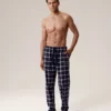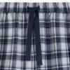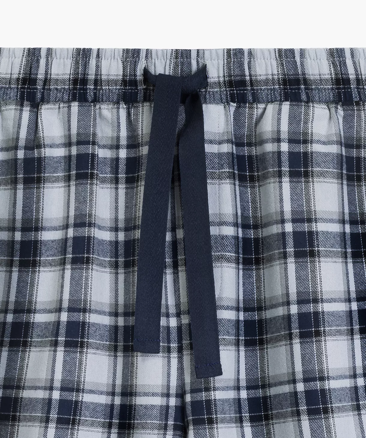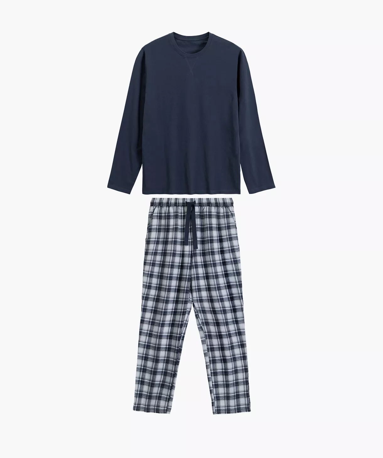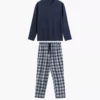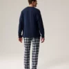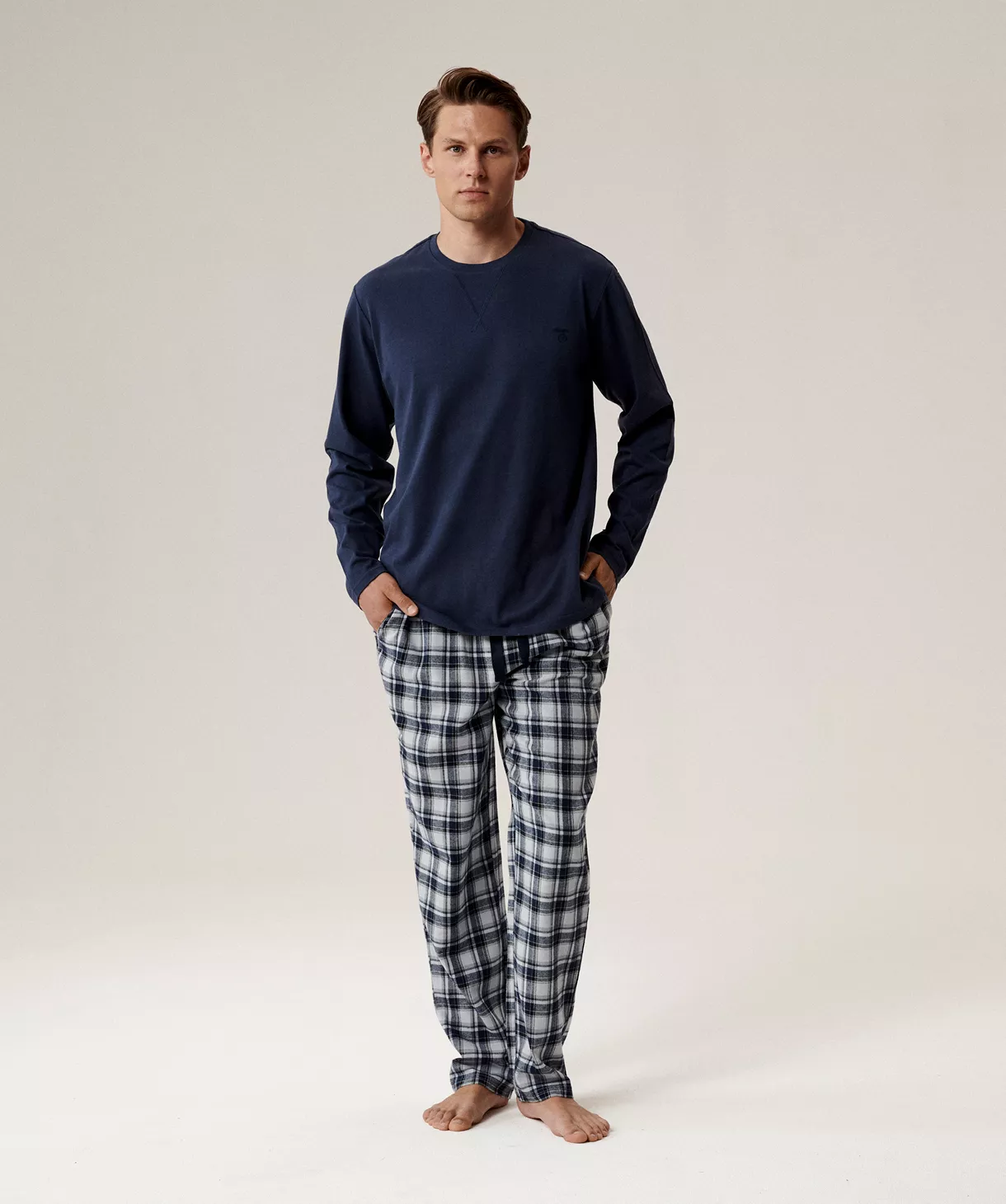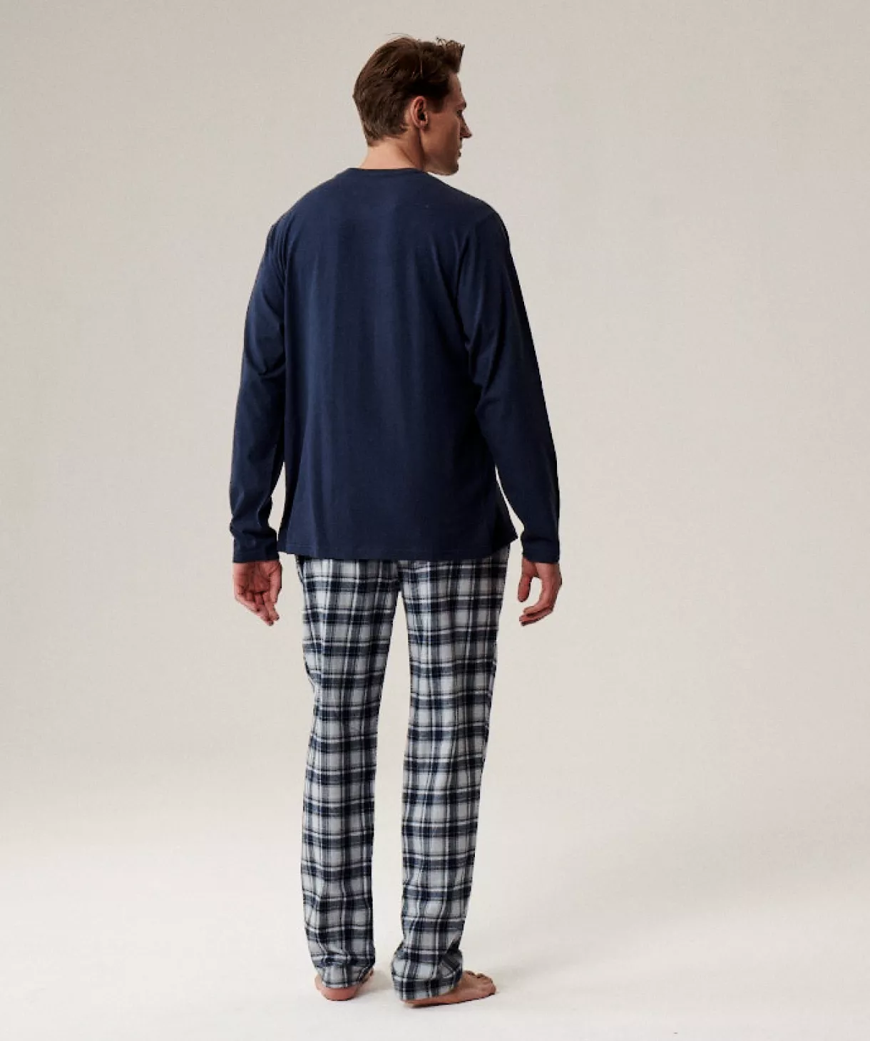 Oto piżama męska, która idealnie sprawdzi się w długie jesienno-zimowe wieczory i chłodne noce. Luźny, gładki longsleeve w granatowym kolorze ma długie rękawy i okrągłe wycięcie przy szyi. Spodnie w granatowo-szarą kratkę mają luźne nogawki bez ściągaczy u dołu, dwie kieszenie po bokach i wiązanie w pasie na szeroki sznurek.