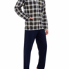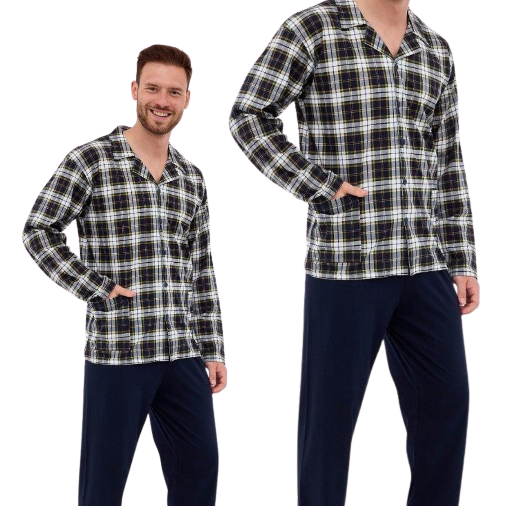 Piżama męska rozpinana wykonana z wysokiej jakości bawełny to gwarancja komfortu i trwałości. Bluza w klasyczną kratę posiada długie rękawy oraz kołnierzyk, co nadaje jej elegancki, a zarazem wygodny wygląd. Zapinana jest na guziki, co ułatwia zakładanie i zdejmowanie, a praktyczne kieszenie dodają funkcjonalności. Do kompletu dołączone są długie, jednolite spodnie, które zapewniają swobodę ruchów i komfort termiczny podczas chłodniejszych nocy. Całość stanowi idealny zestaw dla mężczyzn ceniących styl i wygodę w codziennym wypoczynku.