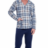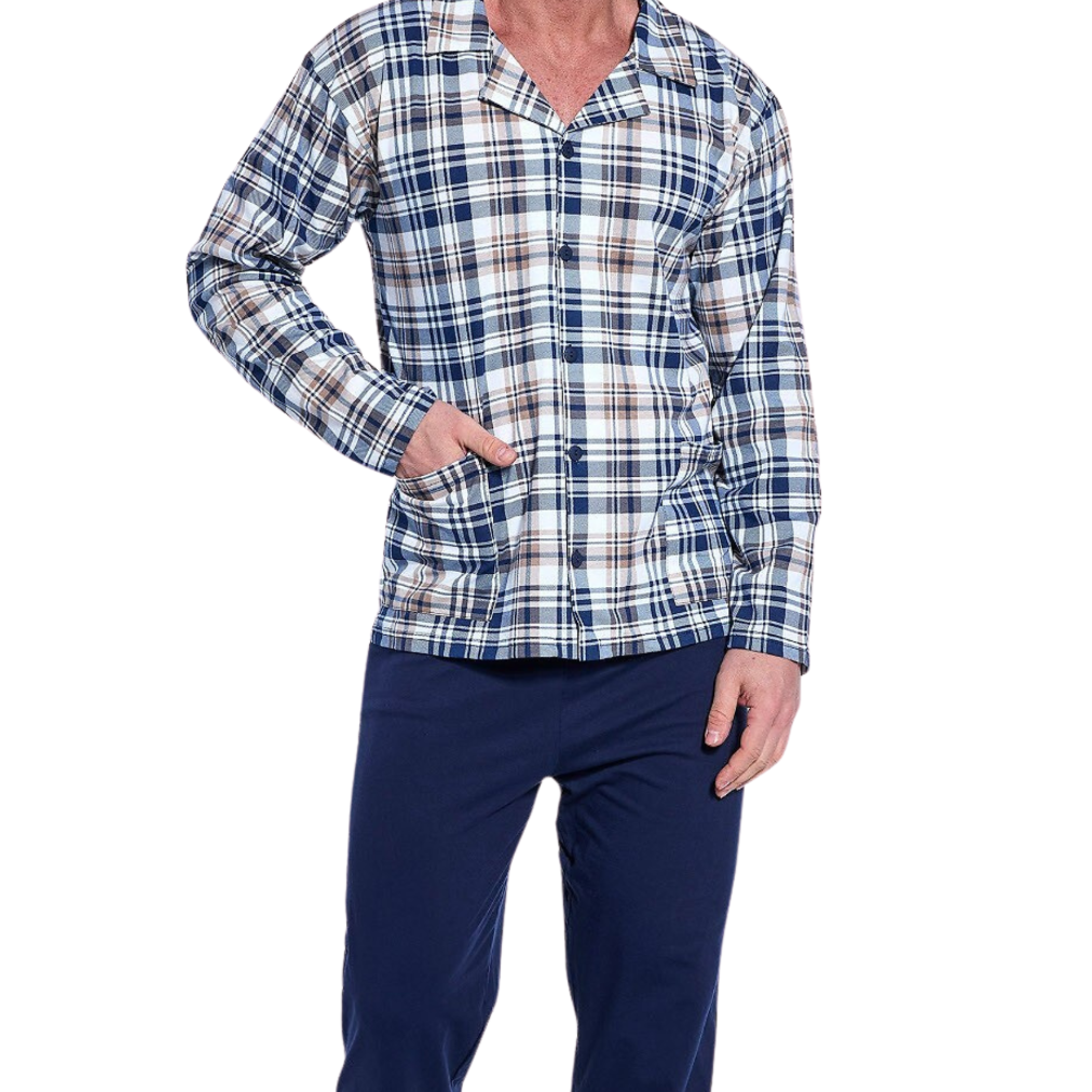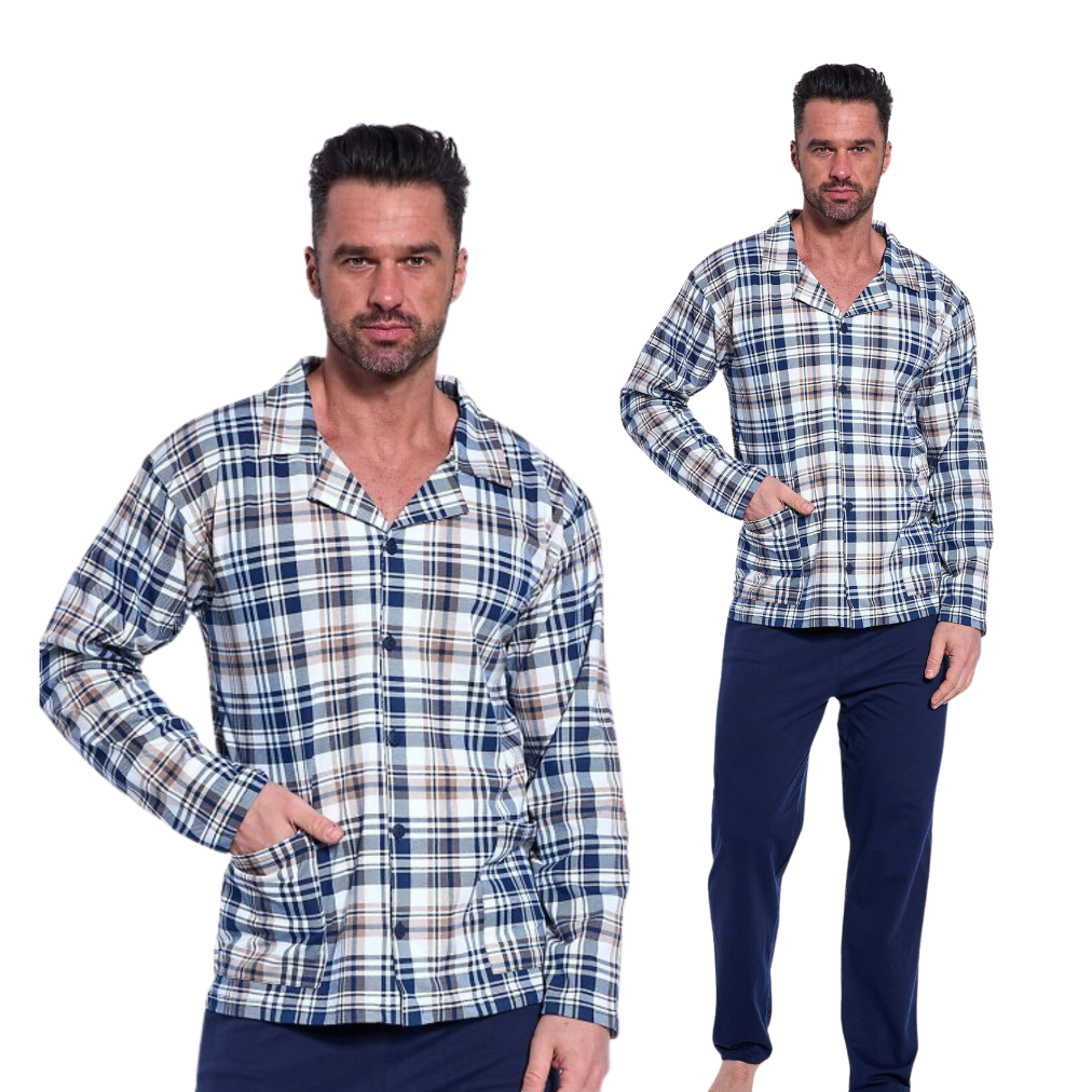 Męska piżama rozpinana to klasyczny zestaw wykonany z wysokiej jakości bawełny, która gwarantuje komfort i oddychalność przez całą noc. Górna część to stylowa bluza w kratkę z długim rękawem, wyposażona w elegancki kołnierzyk, praktyczne kieszenie oraz zapięcie na guziki. To rozwiązanie nie tylko funkcjonalne, ale i estetyczne. Długie, jednolite spodnie dopełniają całości, zapewniając wygodę i swobodę ruchów. Ten ponadczasowy komplet świetnie sprawdzi się na każdą porę roku i będzie doskonałym wyborem zarówno na co dzień, jak i na prezent.