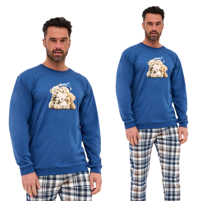 Piżama męska wykonana z wysokiej jakości, miękkiej bawełny to połączenie wygody i stylu, idealna na każdą porę roku. Górę kompletu stanowi koszulka z długim rękawem i okrągłym dekoltem, ozdobiona kolorowym nadrukiem z misiem na piersi, który dodaje całości lekkiego, przyjaznego charakteru. Długie spodnie zapewniają pełną swobodę ruchów, a elastyczna gumka w pasie gwarantuje wygodne dopasowanie. Dodatkowo mankiety, dół bluzy oraz nogawki wykończono ściągaczami, co zapewnia komfort noszenia i chroni przed chłodem. Piżama jest przewiewna, przyjemna w dotyku i trwała, dzięki czemu sprawdzi się zarówno podczas snu, jak i relaksu w domu, łącząc praktyczność z atrakcyjnym wyglądem.