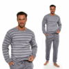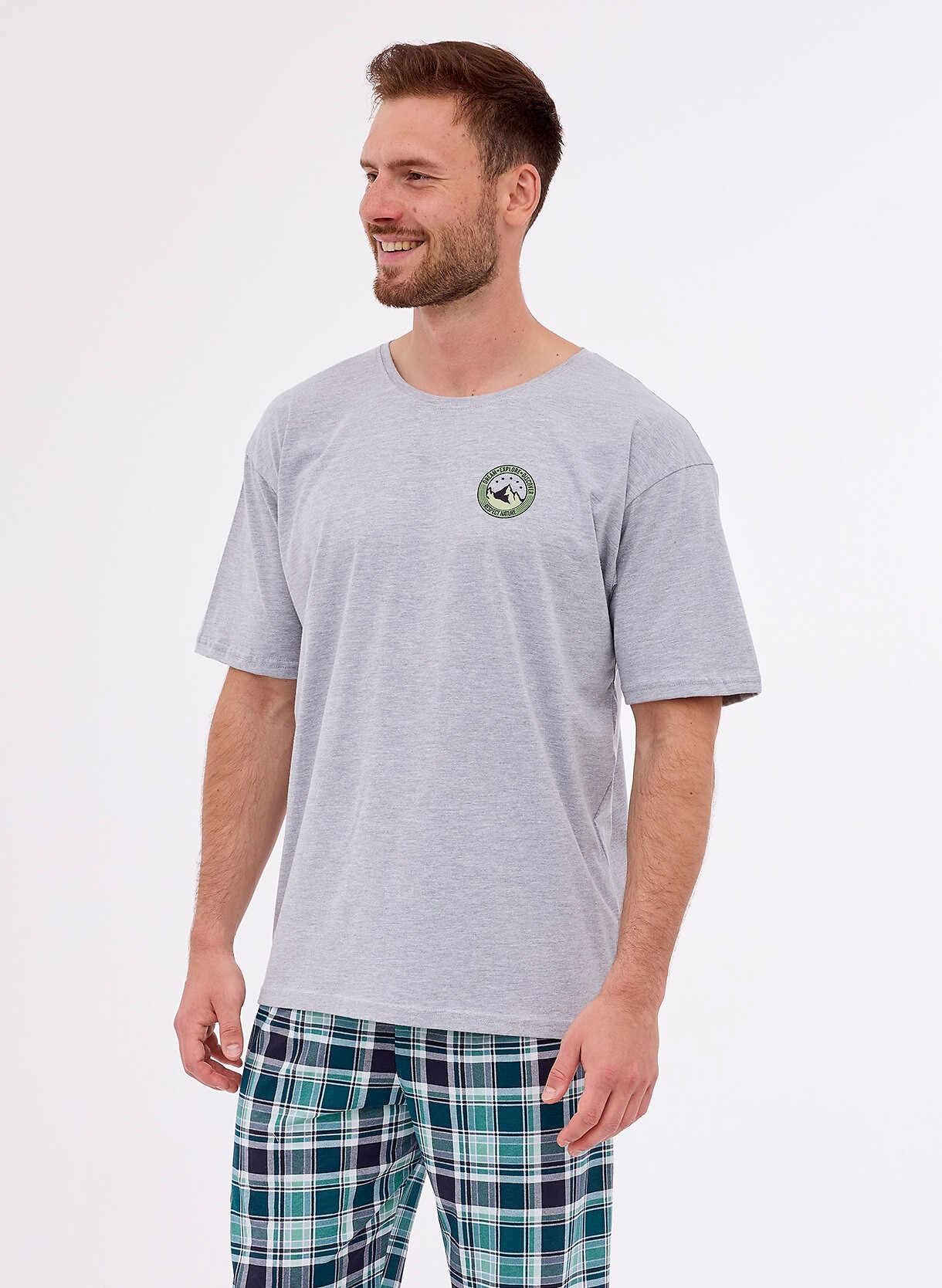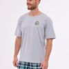 Męska piżama składa się z koszulki z krótkim rękawem i półokrągłym dekoltem, który zapewnia swobodę i komfort noszenia. Na wysokości klatki piersiowej znajduje się subtelny, delikatny nadruk, który dodaje całości nowoczesnego charakteru.