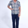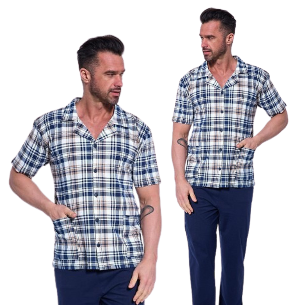 Męska piżama rozpinana to połączenie wygody i klasycznego stylu, idealna na każdą porę roku. Została uszyta z wysokiej jakości, miękkiej bawełny, która jest przewiewna i przyjemna w dotyku, zapewniając komfort noszenia przez całą noc. Górę stanowi koszula w modną kratkę z krótkim rękawem, zapinana na guziki i wyposażona w praktyczne kieszenie oraz elegancki kołnierzyk. Dzięki rozpinanej formie bluza jest wygodna w zakładaniu i dodaje piżamie ponadczasowego charakteru. Długie, jednolite spodnie mają luźny krój, gwarantując swobodę ruchów i pełen komfort snu. Całość doskonale sprawdzi się zarówno w domowym zaciszu, jak i podczas wyjazdów.