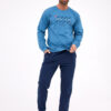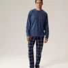 Górę zestawu tworzy koszulka z długim rękawem, wykończona półokrągłym dekoltem i ozdobiona niewielkim nadrukiem na piersi – subtelny akcent, który dodaje całości charakteru. Długie spodnie w klasyczną kratkę nie tylko dobrze wyglądają, ale też doskonale się noszą – dzięki elastycznej gumce w pasie obszytej bawełną, piżama nie uciska i dopasowuje się do sylwetki.
