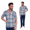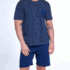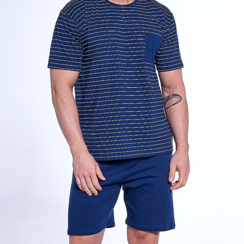 Bawełniana piżama męska to komfortowa propozycja na ciepłe noce i leniwe poranki. Koszulka w paski z krótkim rękawem oraz okrągłym dekoltem prezentuje się stylowo i swobodnie. Dodatkowym, praktycznym akcentem jest naszyta kieszonka na piersi, która dodaje uroku i funkcjonalności. Do kompletu dołączone są luźne, jednolite spodenki o długości do kolan, wykonane z tej samej miękkiej, oddychającej bawełny. Dzięki wygodnej gumce w pasie doskonale dopasowują się do sylwetki, nie krępując ruchów. Piżama idealnie sprawdzi się zarówno na co dzień, jak i podczas wyjazdów. Naturalny materiał i klasyczny fason sprawiają, że to must-have w męskiej garderobie nocnej.