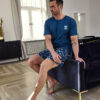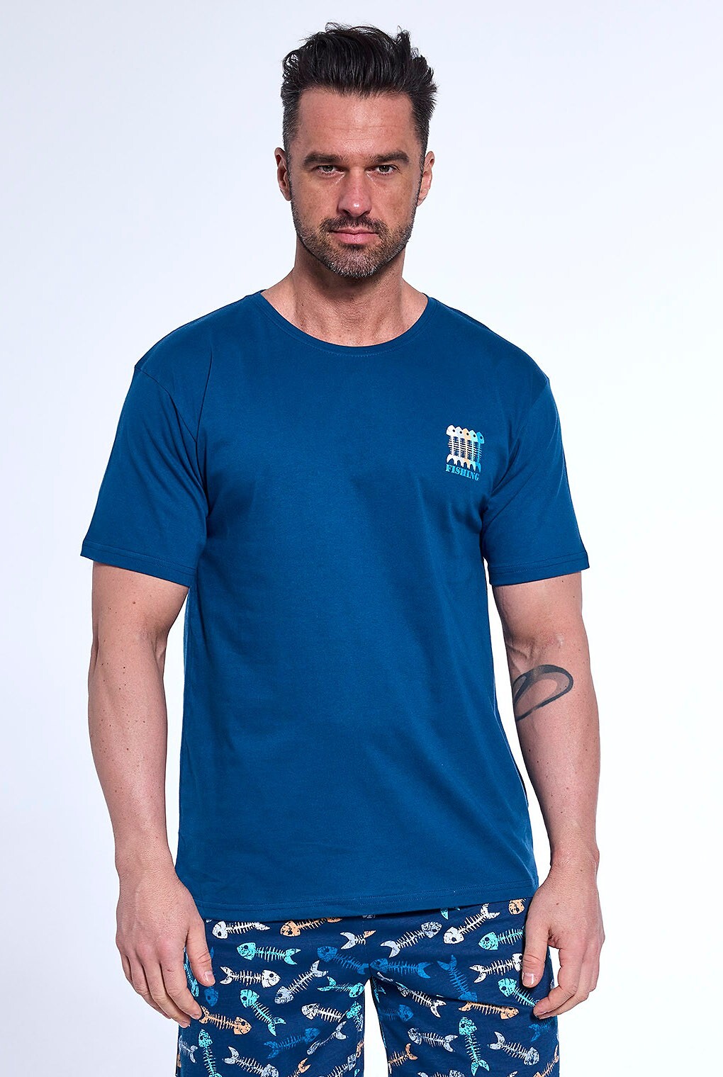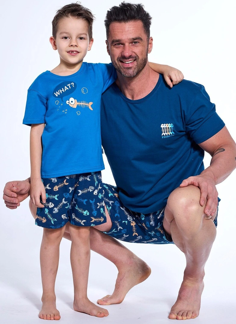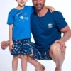 Bawełniana piżama męska to komfortowy i stylowy zestaw idealny na cieplejsze noce. Koszulka z krótkim rękawem posiada klasyczny półokrągły dekolt oraz niewielki nadruk na piersi, który dodaje całości subtelnego charakteru. Do kompletu dołączone są krótkie, wzorzyste spodenki, które nadają piżamie nowoczesny wygląd. W pasie zastosowano elastyczną gumkę obszytą bawełną, co zapewnia wygodne dopasowanie bez ucisku. Całość wykonana jest z miękkiej, oddychającej bawełny, która gwarantuje komfort noszenia i swobodę ruchów podczas snu i wypoczynku.