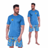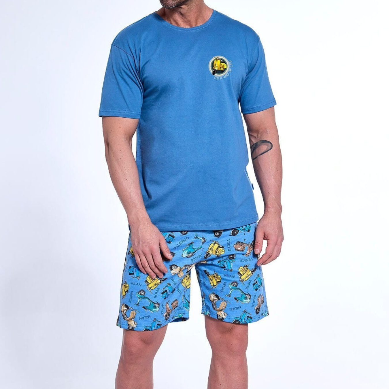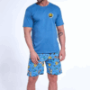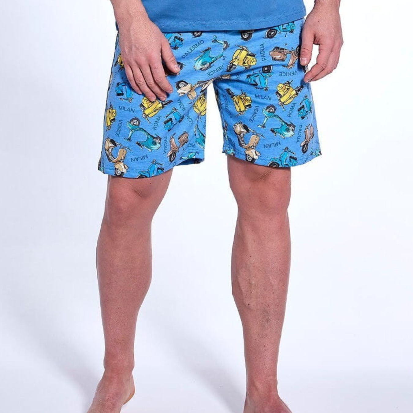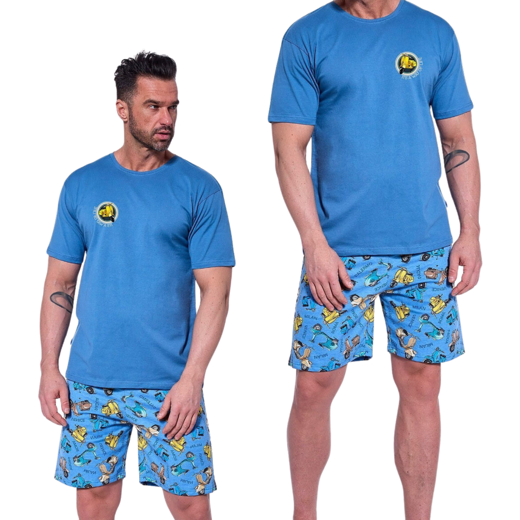 Bawełniana piżama męska to wygodny i praktyczny komplet na ciepłe dni i noce. Koszulka z krótkim rękawem posiada półokrągły dekolt, który zapewnia swobodę i komfort noszenia. Na piersi znajduje się niewielki, stylowy nadruk dodający całości charakteru. Do kompletu dołączone są krótkie, wzorzyste spodenki, które świetnie współgrają z górą piżamy. W pasie spodenek znajduje się gumka obszyta bawełną, co gwarantuje wygodne dopasowanie, bez ucisku. Wykonana w 100% z miękkiej i przewiewnej bawełny, piżama pozwala skórze oddychać i zapewnia komfort przez całą noc. Idealna na letnie wieczory, łącząc styl i funkcjonalność w jednym zestawie.
