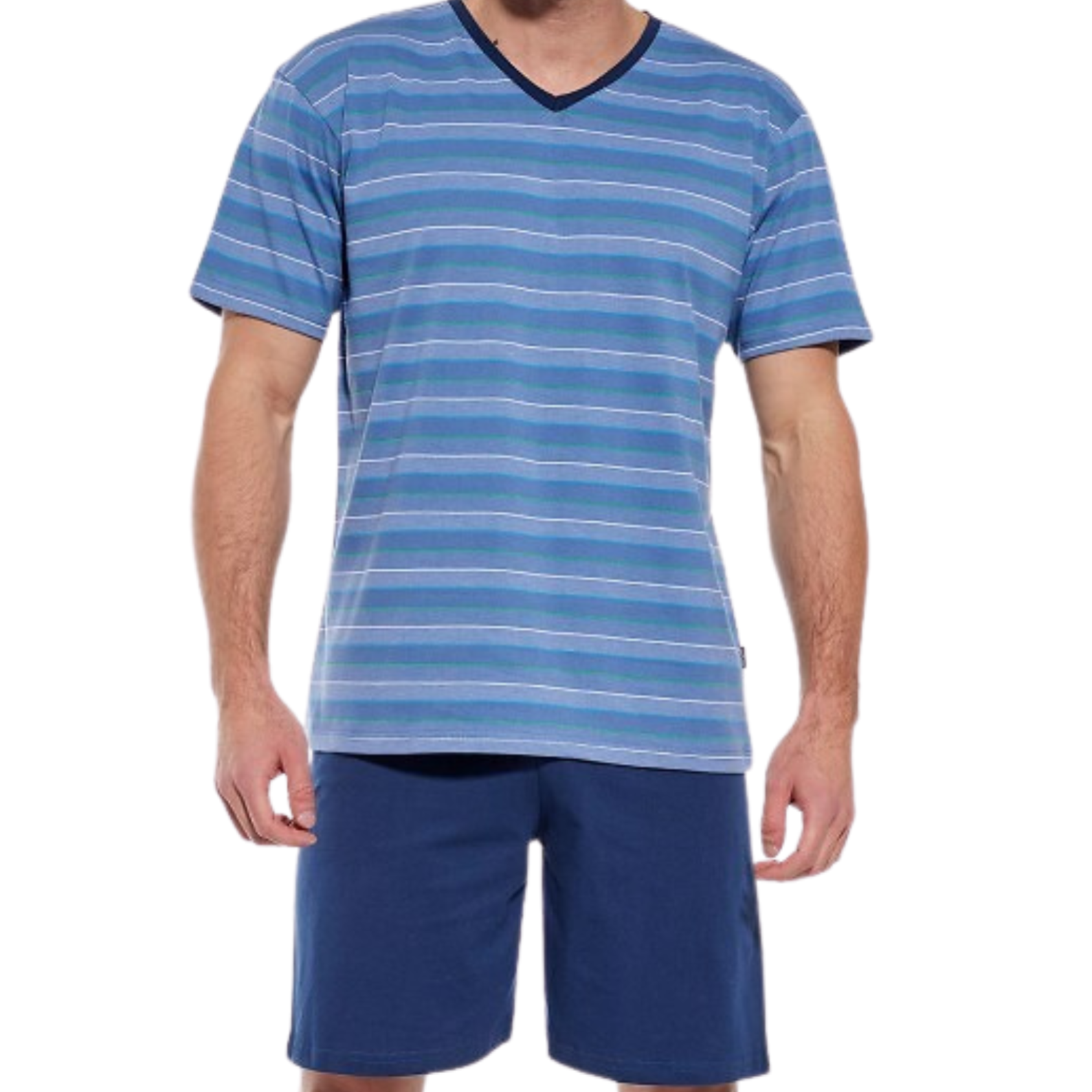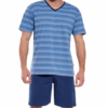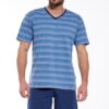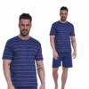Bawełniana piżama męska – idealna na ciepłe noce. W zestawie lekka koszulka z krótkim rękawem, ozdobiona klasycznym wzorem w paski oraz dekoltem w szpic, który dodaje sportowego charakteru. Do kompletu jednolite, krótkie spodenki z wygodną gumką w pasie, obszytą miękką bawełną – zapewniają maksymalny komfort i swobodę ruchów. Wykonana w 100% z naturalnej bawełny, oddychająca i przyjemna w dotyku. Stylowy, a zarazem funkcjonalny wybór na każdą letnią noc.