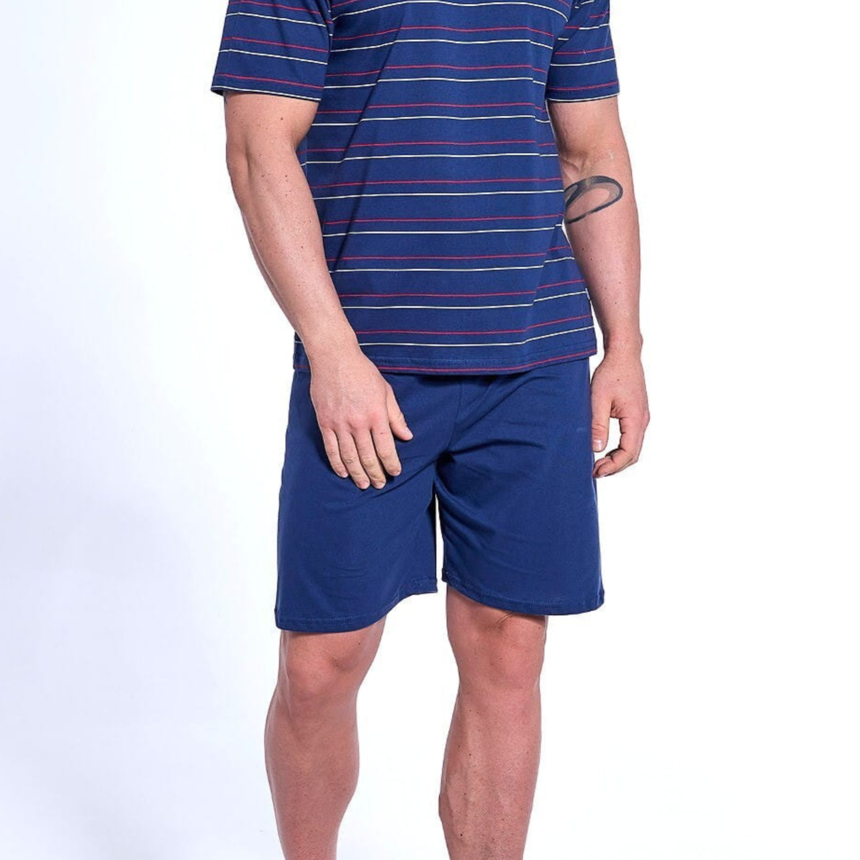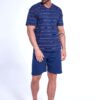 Bawełniana piżama męska to doskonały wybór na ciepłe noce, zapewniający wygodę i komfort snu. Składa się z dwóch elementów – koszulki i spodenek. Koszulka wykonana jest z miękkiej bawełny, zdobiona modnym wzorem w paski. Posiada krótki rękaw, który zapewnia odpowiednią wentylację i swobodę ruchów. Dekolt w kształcie litery „V” (w szpic) dodaje klasycznego, a zarazem stylowego wyglądu.