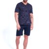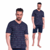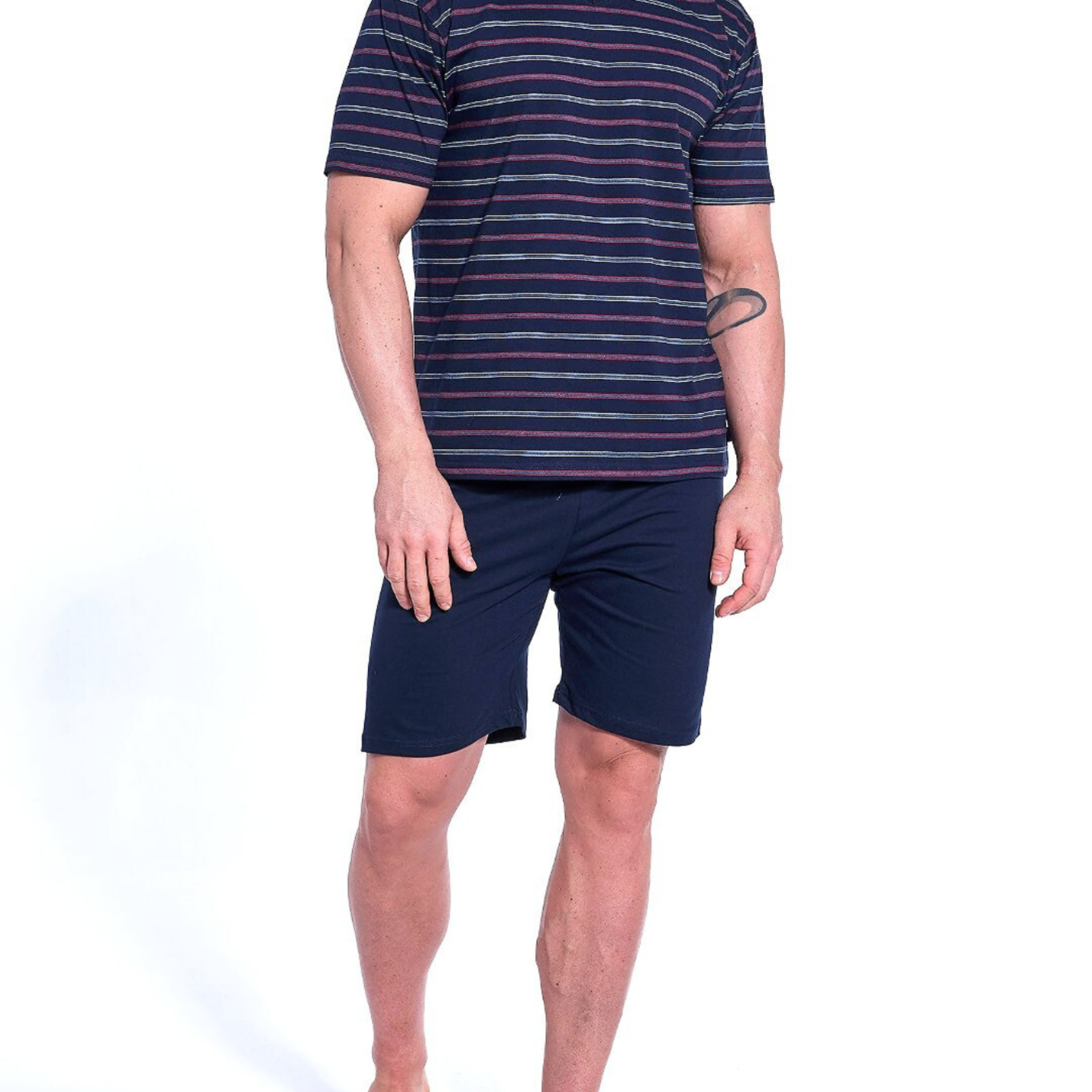 Bawełniana piżama męska to idealny wybór na ciepłe dni i noce. Koszulka w paski z krótkim rękawem ma modny dekolt w szpic, który nadaje jej lekko elegancki wygląd. Krótkie, jednolite spodenki zapewniają komfort i swobodę ruchów, a wygodna gumka w pasie, obszyta bawełną, gwarantuje idealne dopasowanie bez ucisku. Wykonana z naturalnej bawełny, piżama jest przewiewna i przyjazna dla skóry, co zapewnia wygodę przez całą noc.