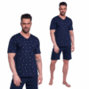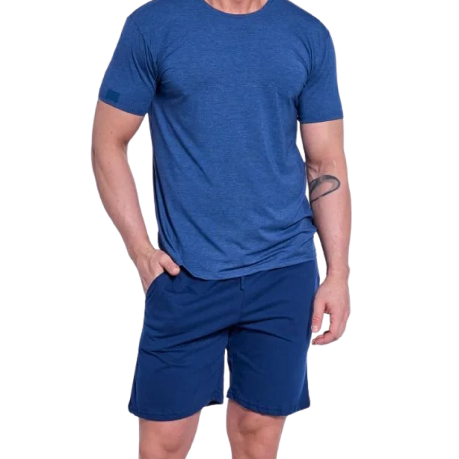 Stylowa i wygodna piżama męska to idealny wybór na każdą porę roku. Melanżowa koszulka z krótkim rękawem i okrągłym dekoltem została uszyta z miękkiej, przyjemnej w dotyku dzianiny – mieszanki bawełny i modalu, co zapewnia wyjątkowy komfort noszenia i przewiewność. Do kompletu dołączone są luźne spodenki bawełniane o długości do kolan, które nie krępują ruchów i świetnie sprawdzą się podczas snu czy odpoczynku w domu. W pasie znajduje się elastyczna gumka oraz wiązany troczek, umożliwiający regulację obwodu dla idealnego dopasowania. Dodatkowo praktyczne kieszenie na biodrach zwiększają funkcjonalność zestawu. To piżama łącząca nowoczesny design z codzienną wygodą.