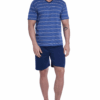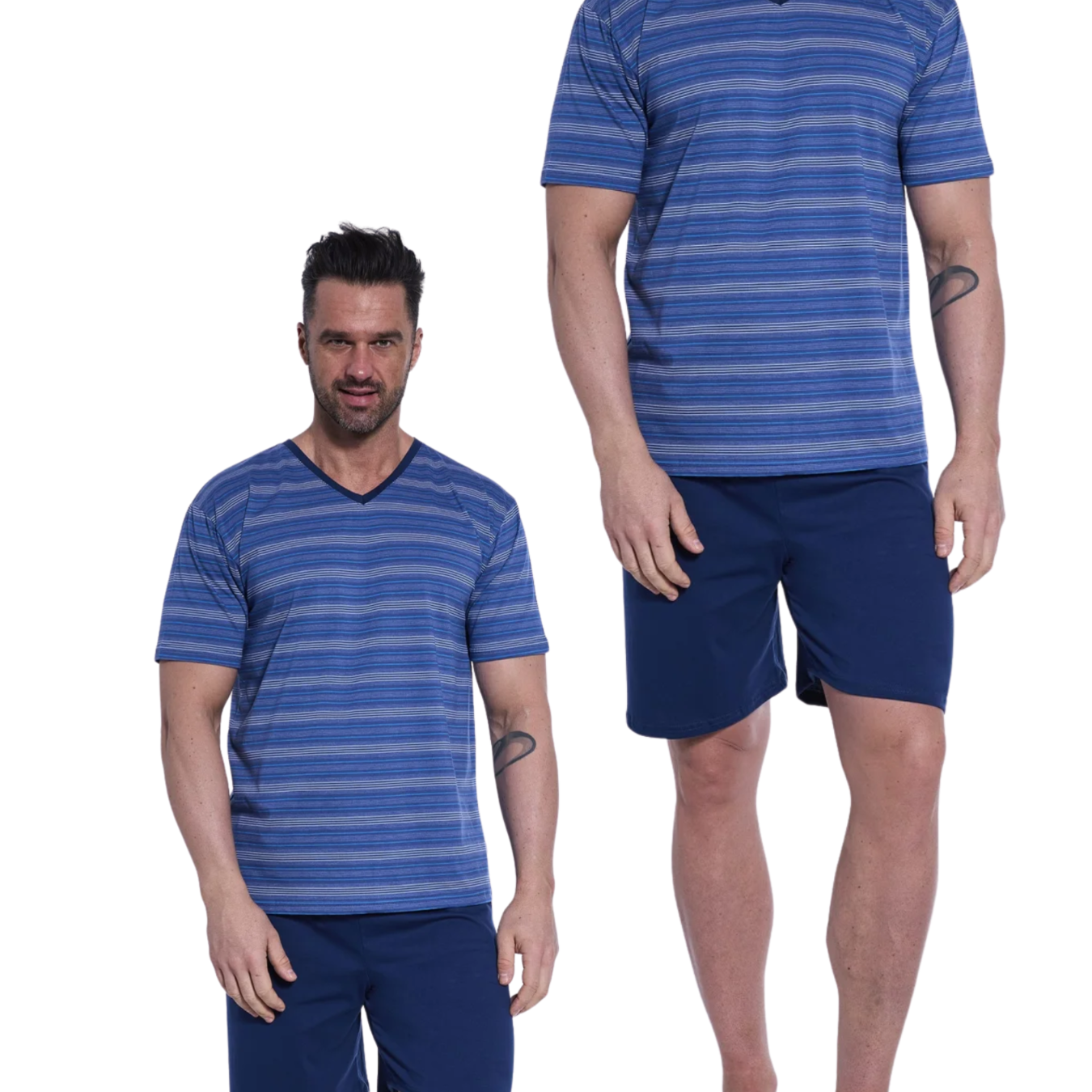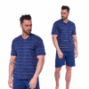 Bawełniana piżama męska to wygodny i stylowy komplet idealny na cieplejsze noce. Składa się z koszulki z krótkim rękawem, ozdobionej klasycznym wzorem w paski. Dekolt w szpic dodaje jej lekkości i podkreśla męski charakter. Koszulka została zaprojektowana z myślą o swobodnym dopasowaniu i komforcie noszenia. Do zestawu dołączone są krótkie, jednolite spodenki, które idealnie komponują się z górą piżamy. W pasie posiadają elastyczną gumkę obszytą bawełnianym materiałem, dzięki czemu nie uciskają i dobrze trzymają się na biodrach. Całość wykonana jest z miękkiej, oddychającej bawełny, która zapewnia komfort i wygodę przez całą noc.