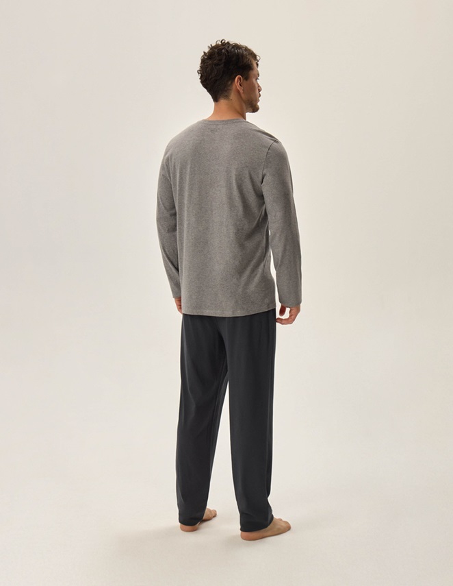 Piżama męska Japan to propozycja w stonowanej, szarej kolorystyce, idealna na spokojne, relaksujące wieczory. Zestaw składa się z bluzki z długim rękawem oraz ciemniejszych spodni o długości do kostek, które razem tworzą harmonijny komplet. Miękka dzianina bawełniana jest przyjemna w dotyku i delikatna dla skóry, zapewniając wysoki komfort noszenia. Dzięki naturalnym, oddychającym materiałom piżama świetnie sprawdzi się przez cały rok – zarówno w chłodniejsze noce, jak i podczas domowego relaksu. To połączenie klasycznego wyglądu z funkcjonalnością, które doceni każdy mężczyzna ceniący wygodę i jakość.