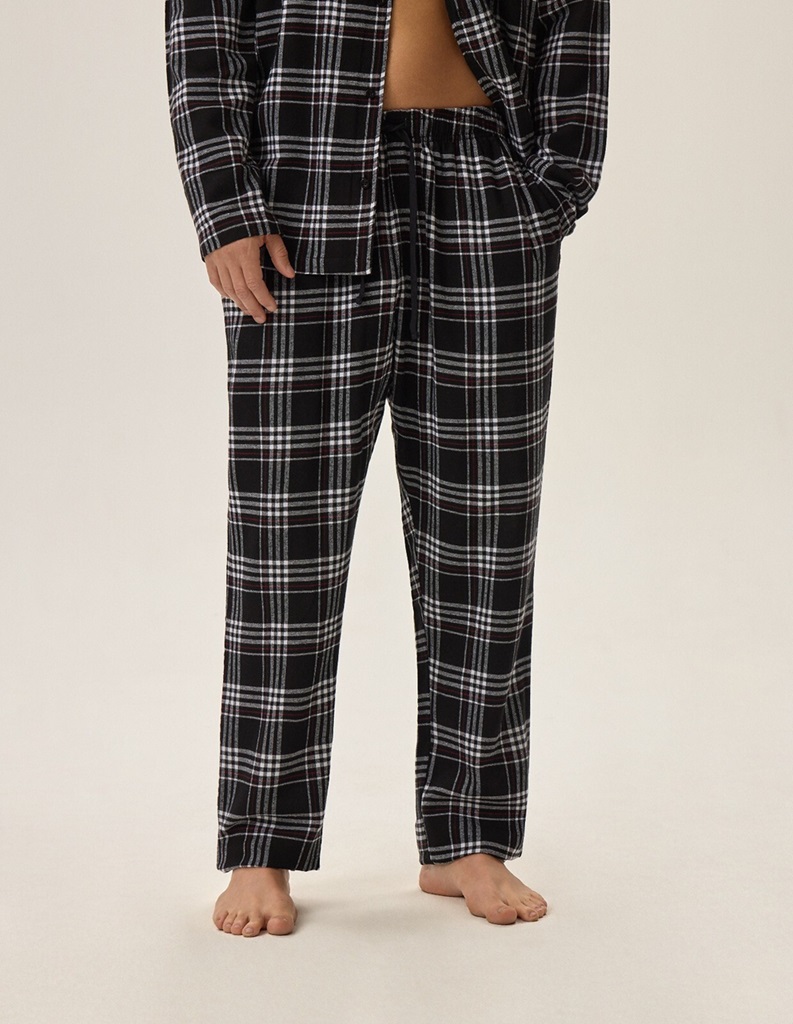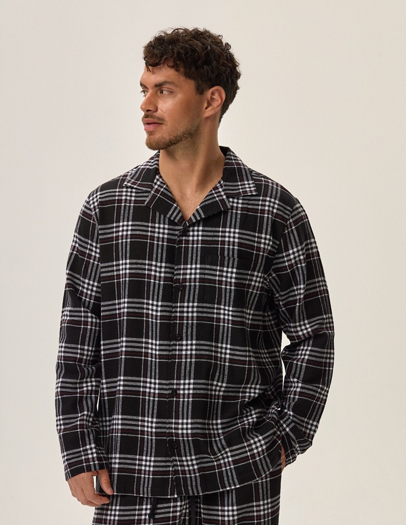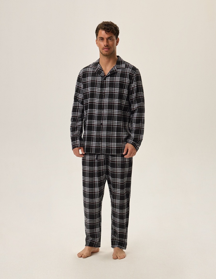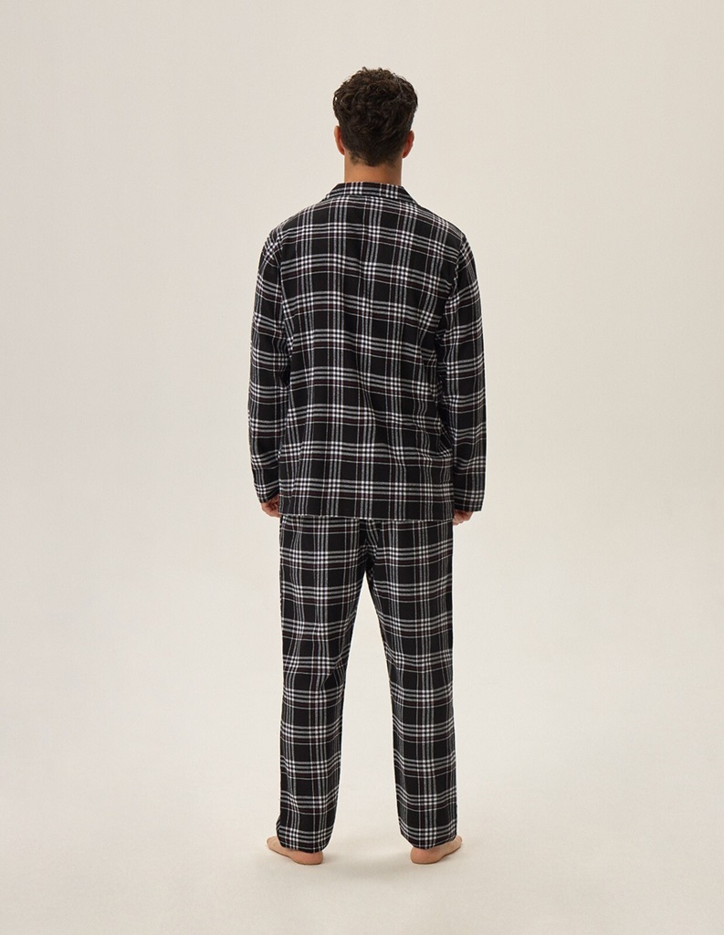 Czarny kolor piżamy to klasyczny wybór, który zawsze prezentuje się elegancko. Dodatkowym atutem jest stylowy, kraciasty wzór z dużymi okienkami, który nadaje piżamie wyjątkowy charakter. Taki design sprawia, że piżama nie tylko dobrze wygląda, ale także zapewnia przyjemne wrażenie estetyczne – niezależnie od tego, czy relaksujesz się przed snem, czy po prostu spędzasz leniwy wieczór w domu.