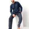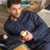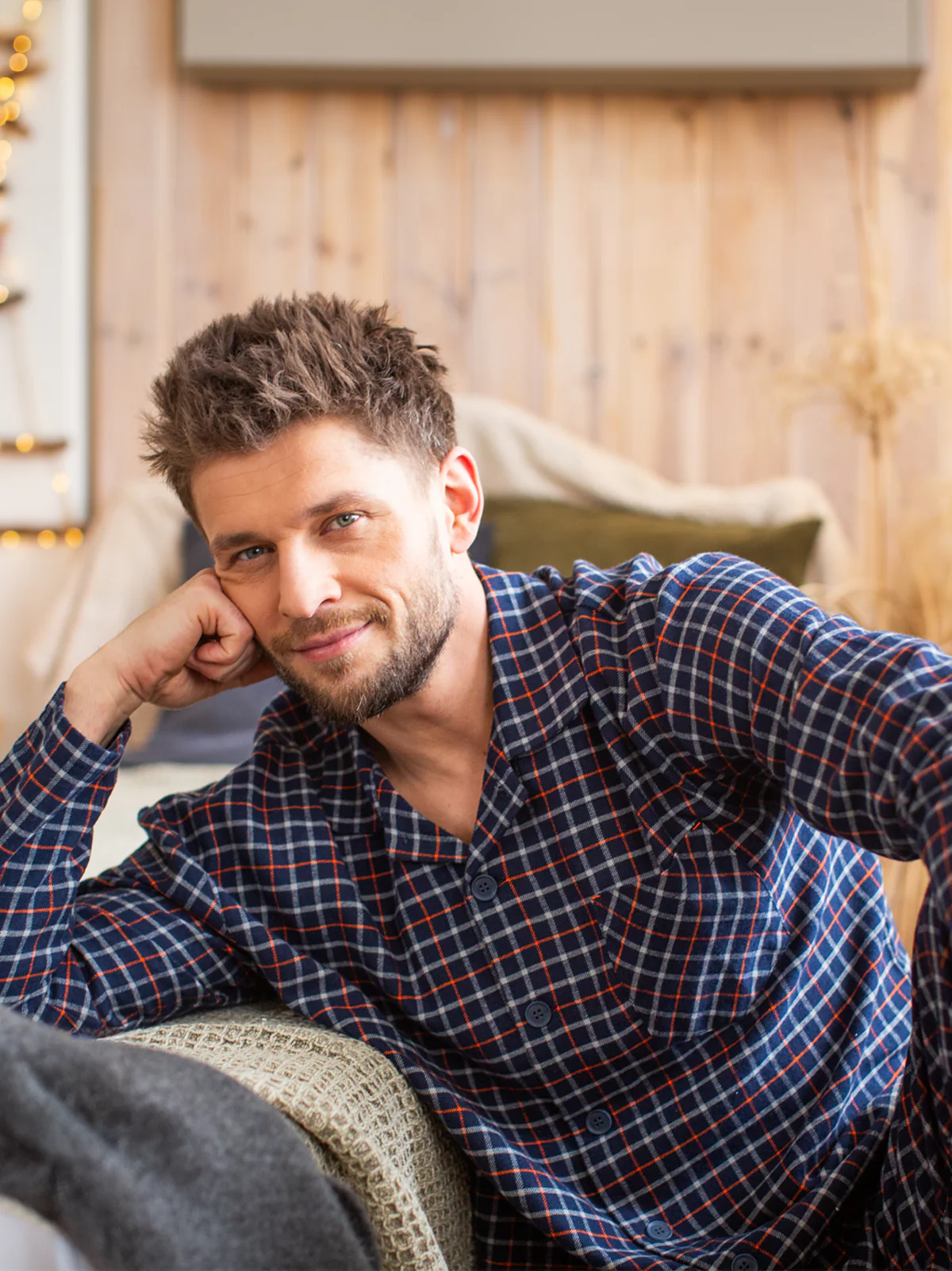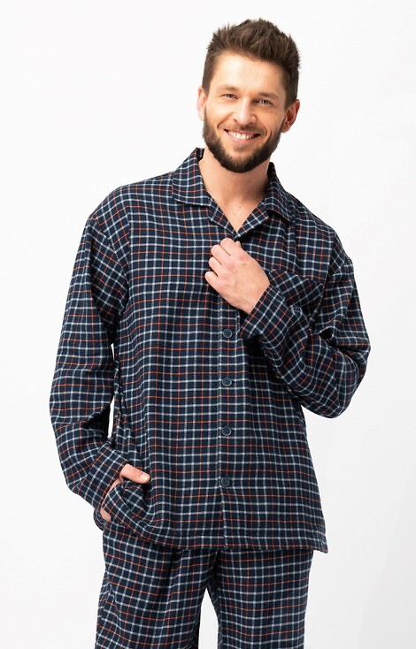 Klasyczna flanelowa piżama męska wykonana w 100% z wysokiej jakości bawełny, zapewniającej miękkość, ciepło i komfort snu przez całą noc. Koszula zapinana na guziki z kołnierzykiem i praktyczną kieszonką na piersi łączy elegancję z funkcjonalnością. Dyskretny guziczek umożliwia zapięcie koszuli wysoko przy szyi, zapewniając dodatkową wygodę i ciepło. Spodnie o kroju lekko zwężających się nogawek gwarantują wygodę oraz swobodę ruchów, a klasyczny fason sprawia, że piżama jest uniwersalna i ponadczasowa. Produkt jest trwały, łatwy w pielęgnacji i zachowuje swój kształt oraz kolory nawet po wielu praniach. Idealny wybór dla mężczyzn ceniących komfort, elegancję i klasyczny styl.