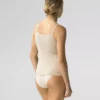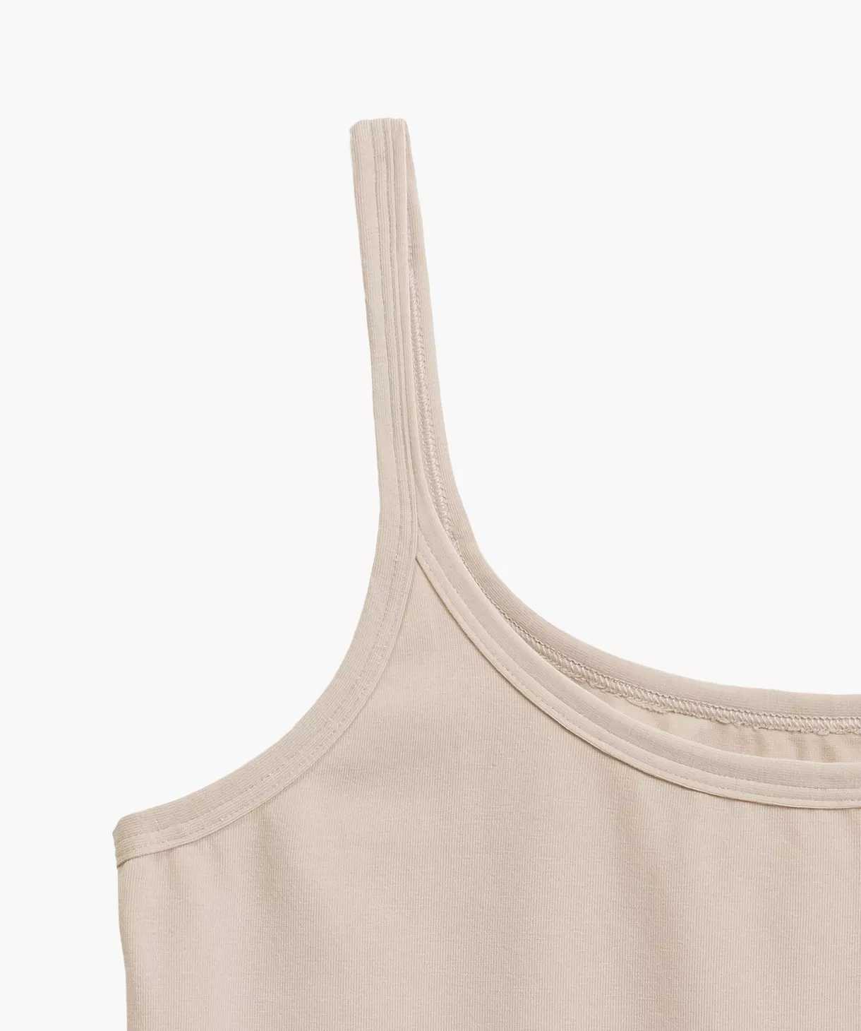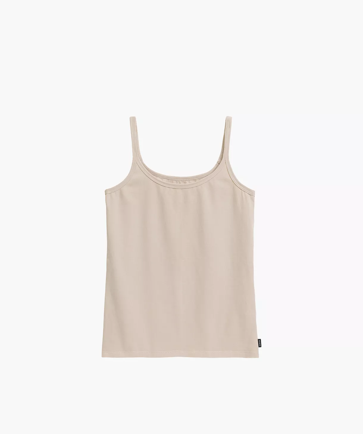 Koszulka na ramiączkach w subtelnym odcieniu jasnego beżu, to świetny pomysł na bardzo kobiece stylizacje.