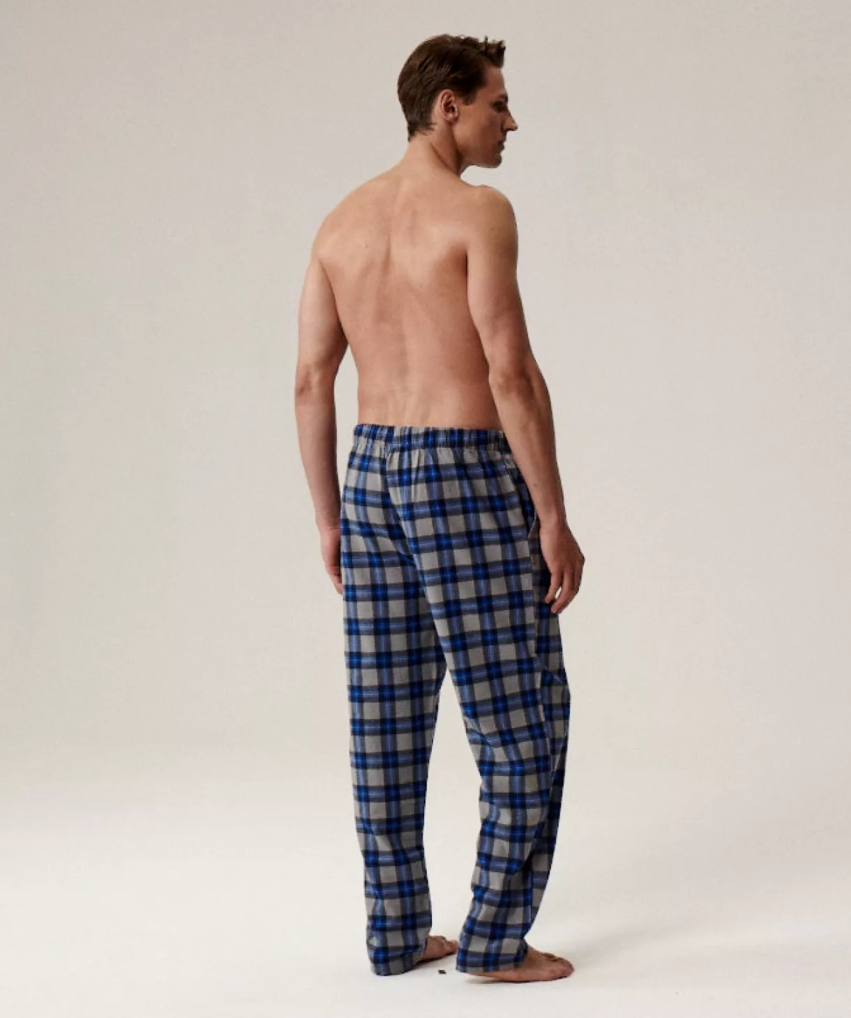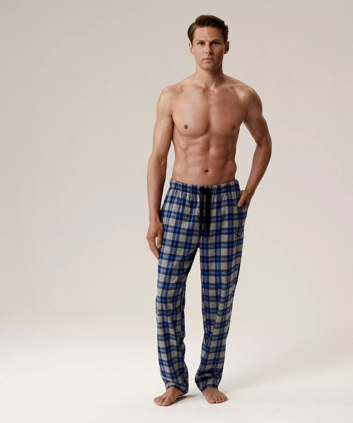 Spodnie męskie w ponadczasowy kraciasty wzór w kolorze szaro-niebieskim, sprawdzą się zarówno jako spodnie do spania, jak i do domowego relaksu. Spodnie mają w pasie sznurek do regulacji, co umożliwia idealne dopasowanie do sylwetki, boczne praktyczne kieszenie oraz luźno puszczone nogawki.